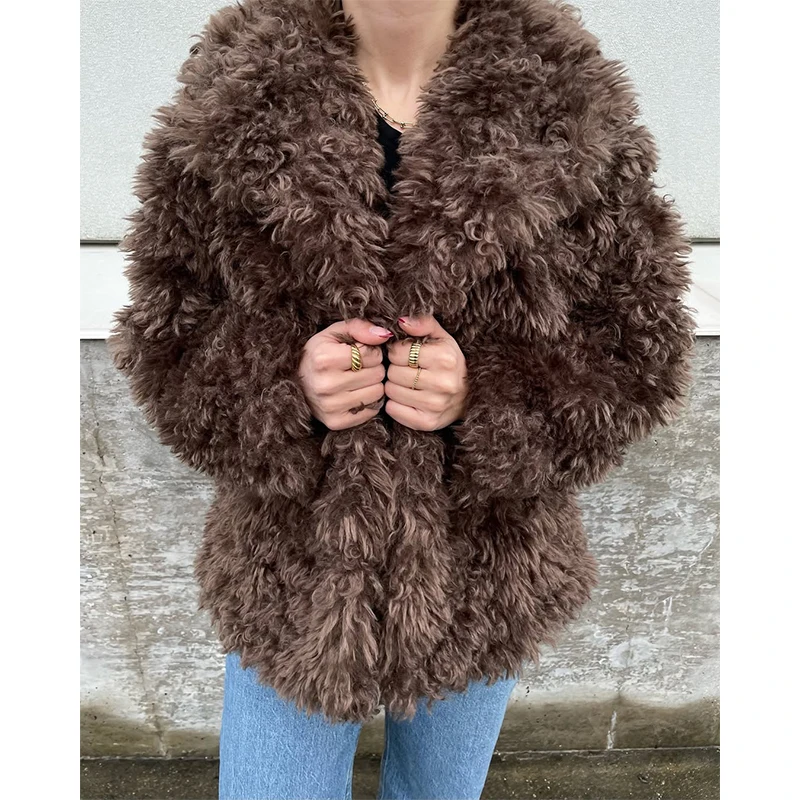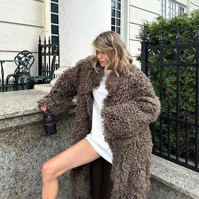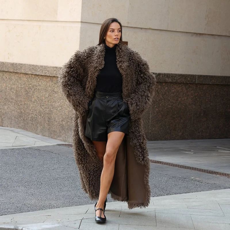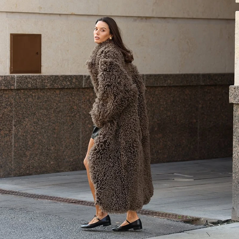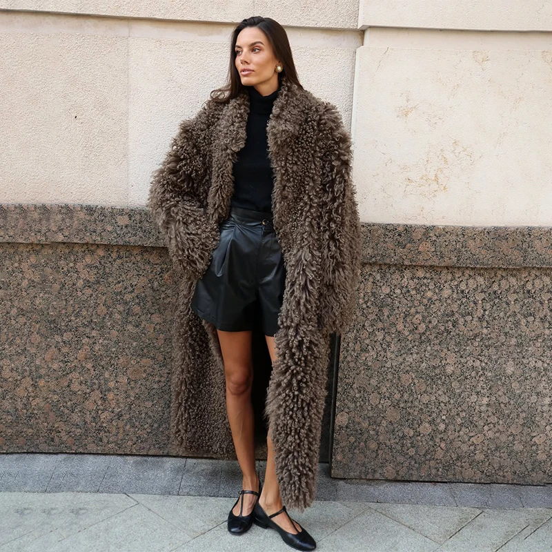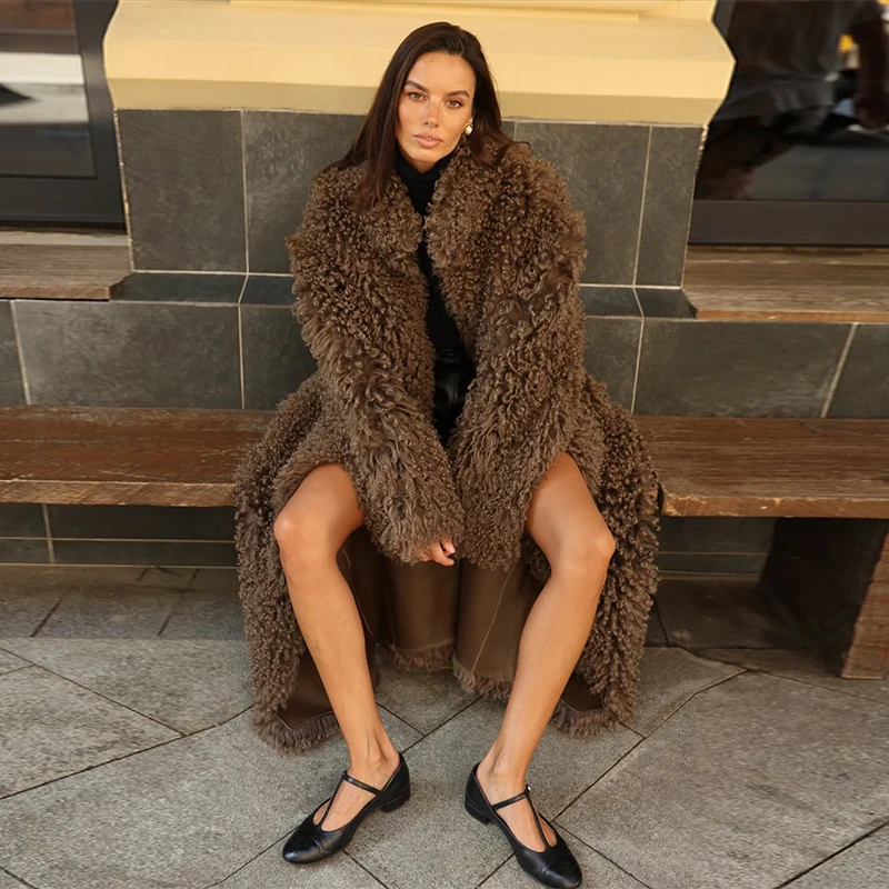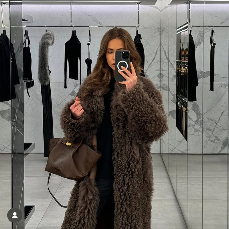 Women Solid Lamb Fur Long Coat Elegant Fashion Lapel Full Sleeve Warm Coats Lady Chic High Street Casual Winter Outerwear 2025