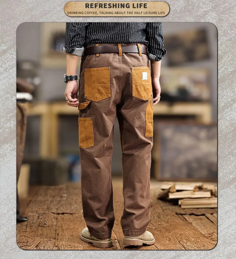 American-style Patchwork Color Block Casual Pants with Loose Straight-leg and Heavy-duty Functional Design