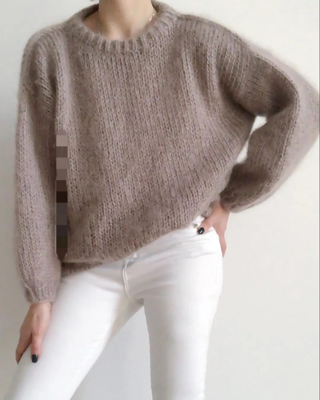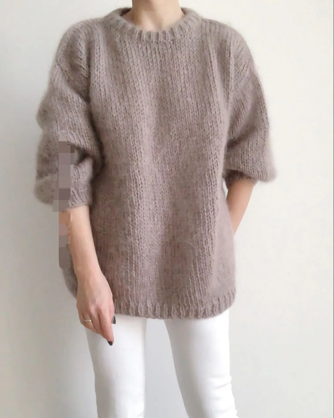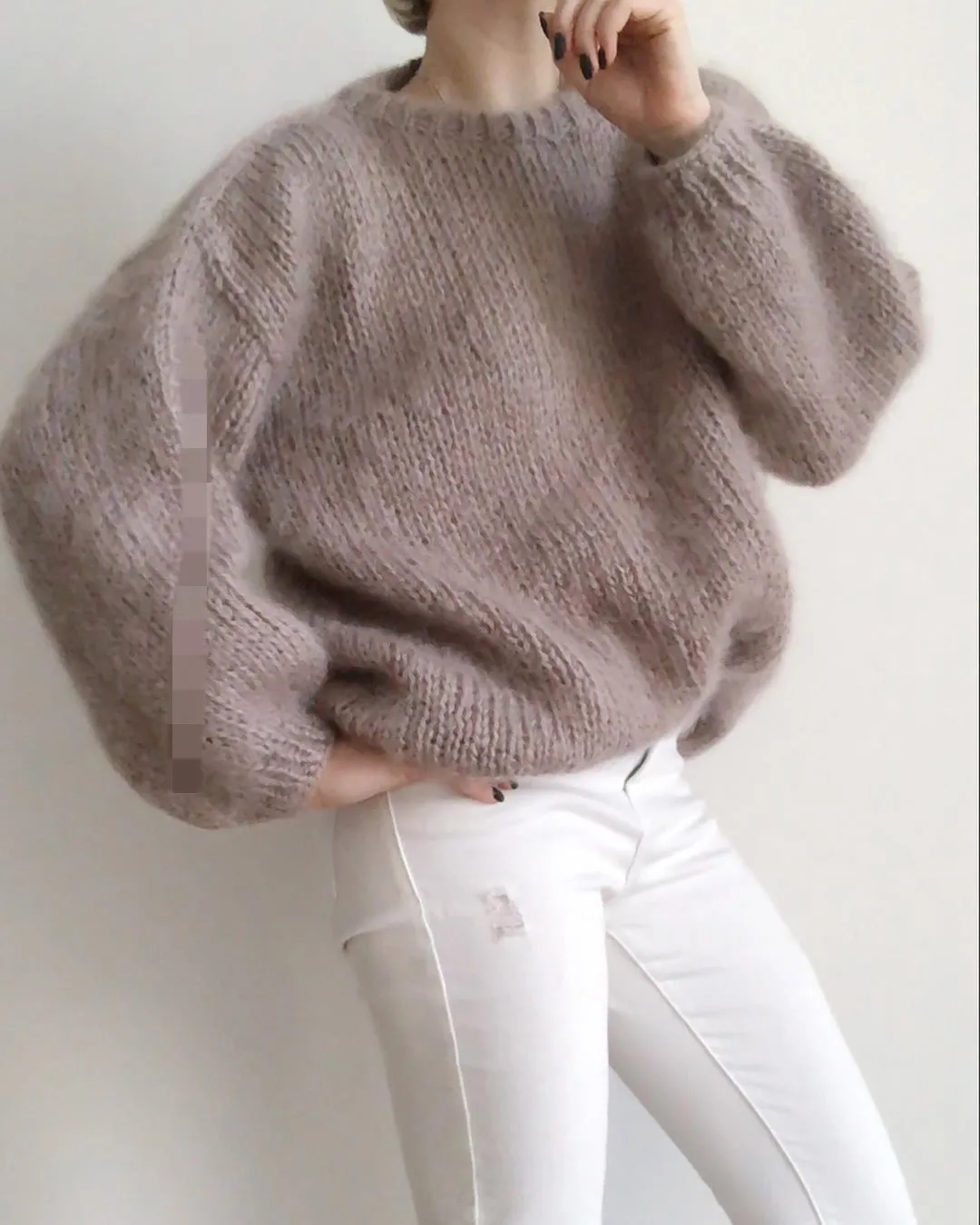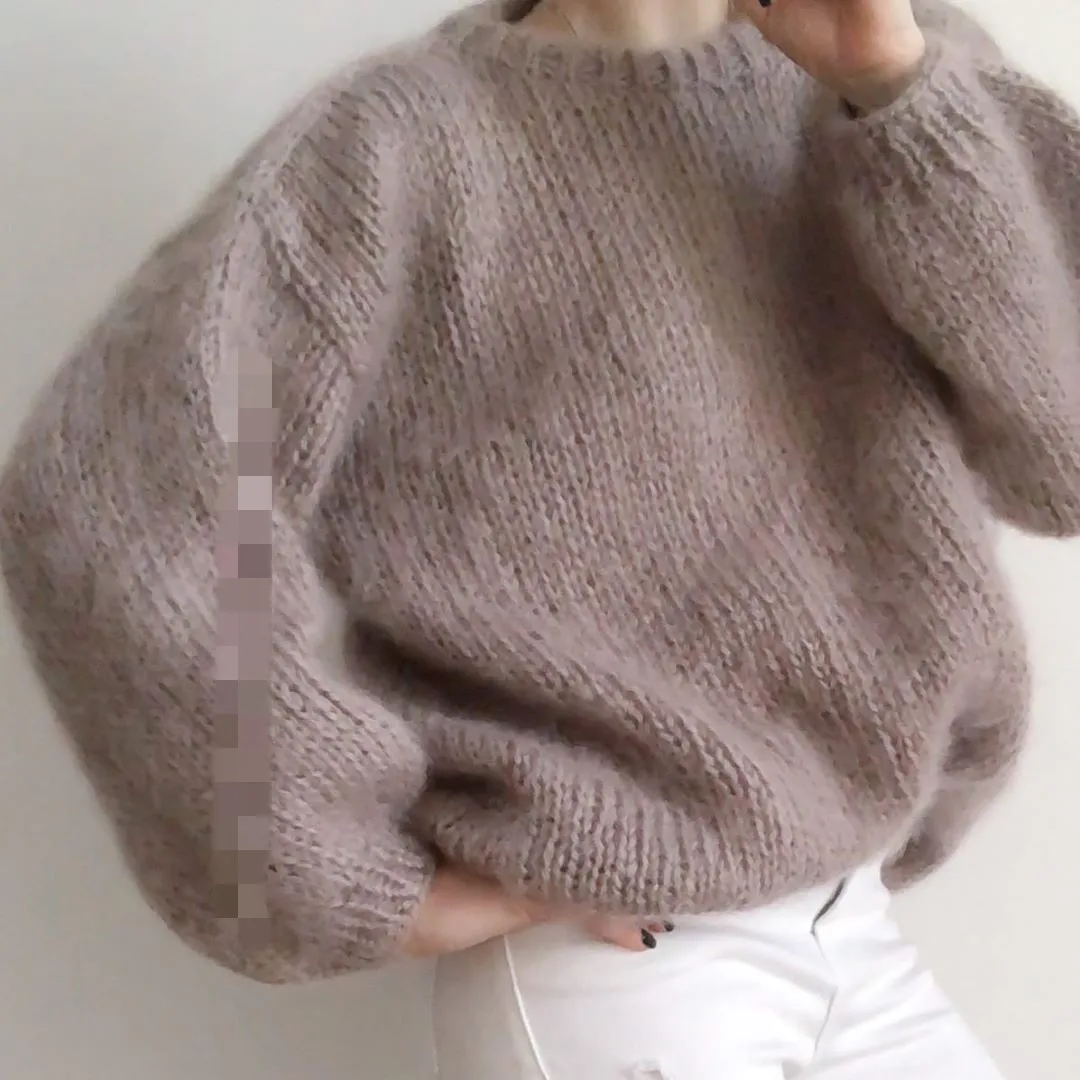 Autumn women's khaki long sleeved round neck pullover lightweight new loose casual soft bubble sleeve mohair jacket mid length