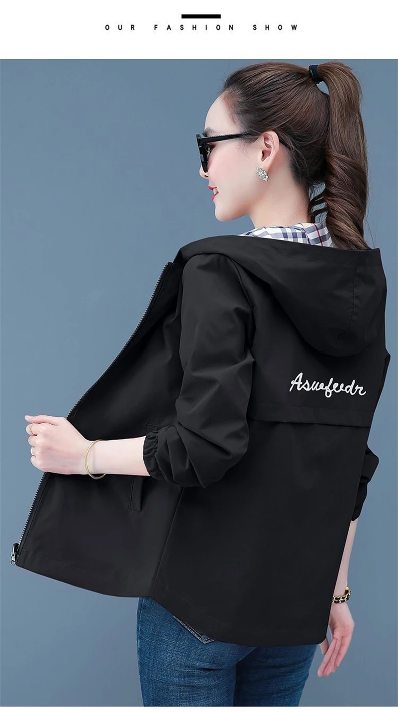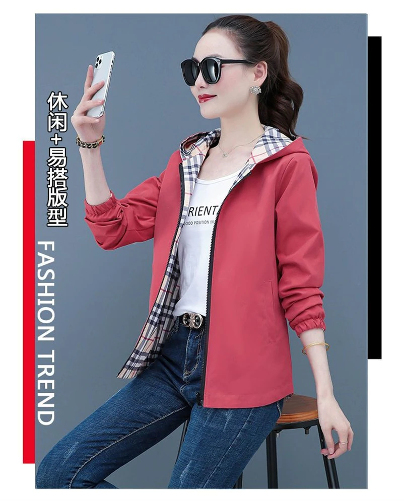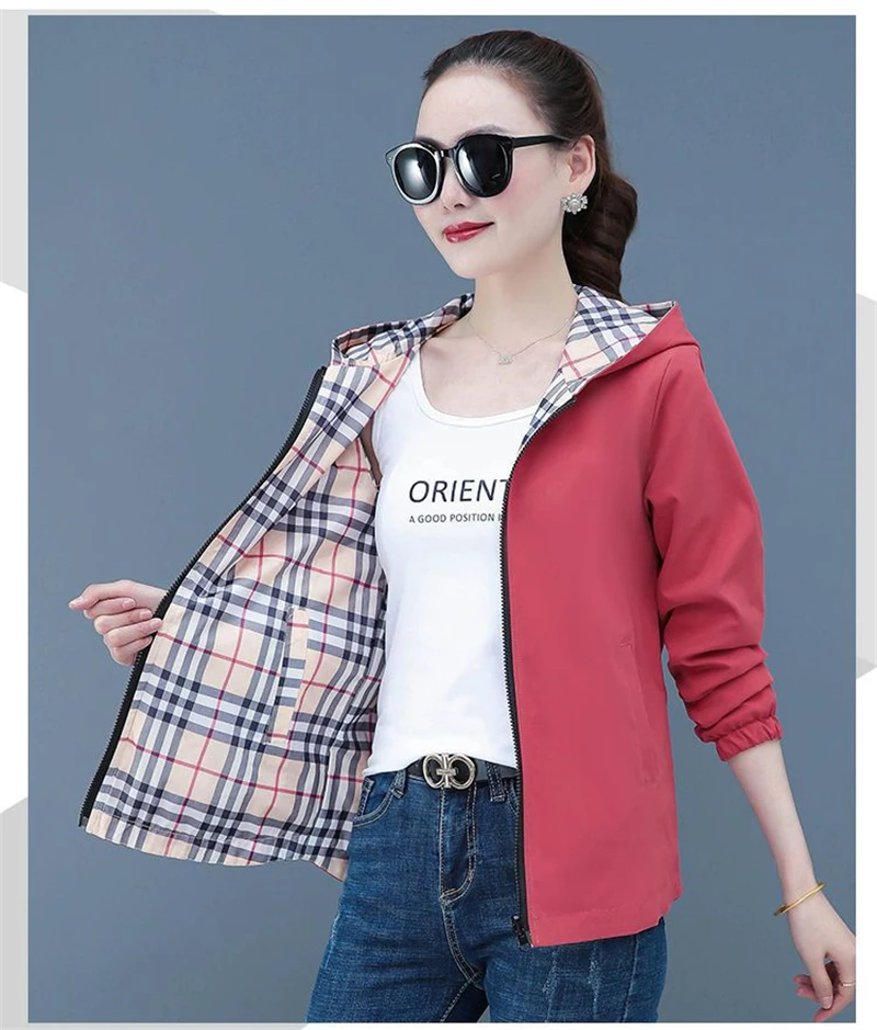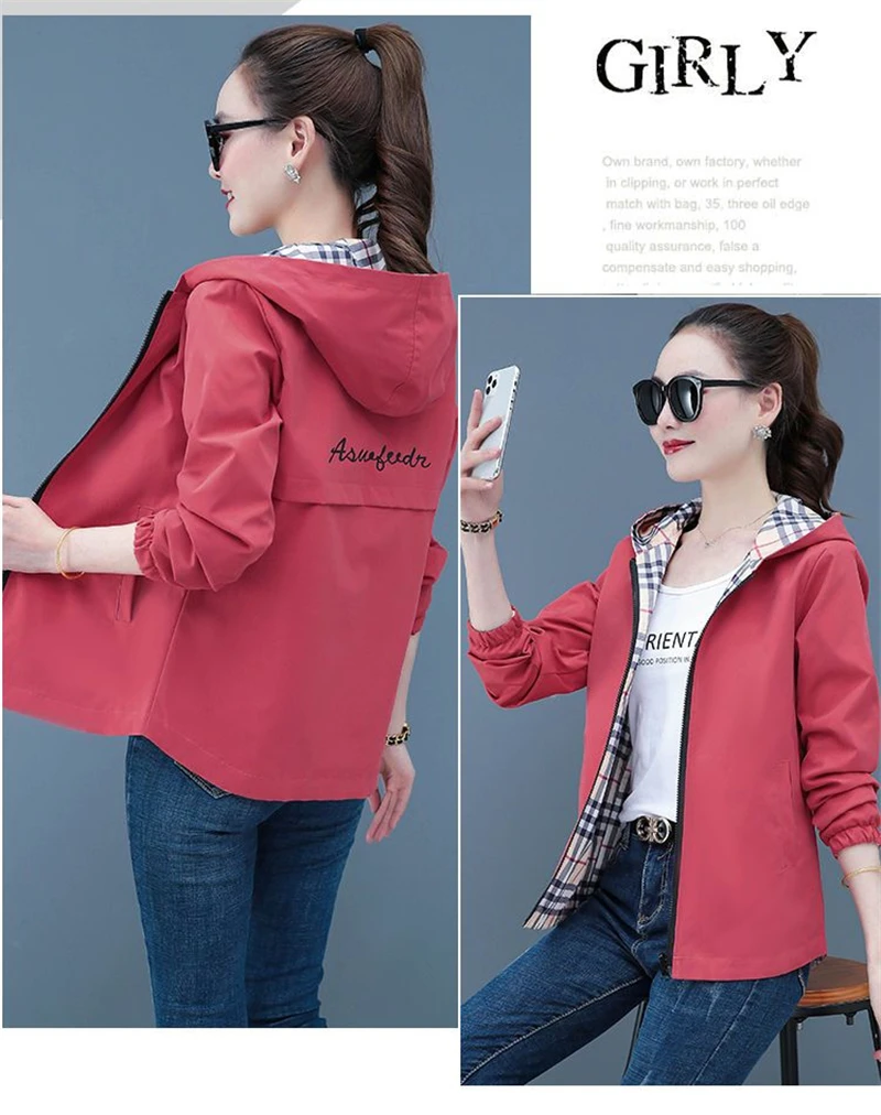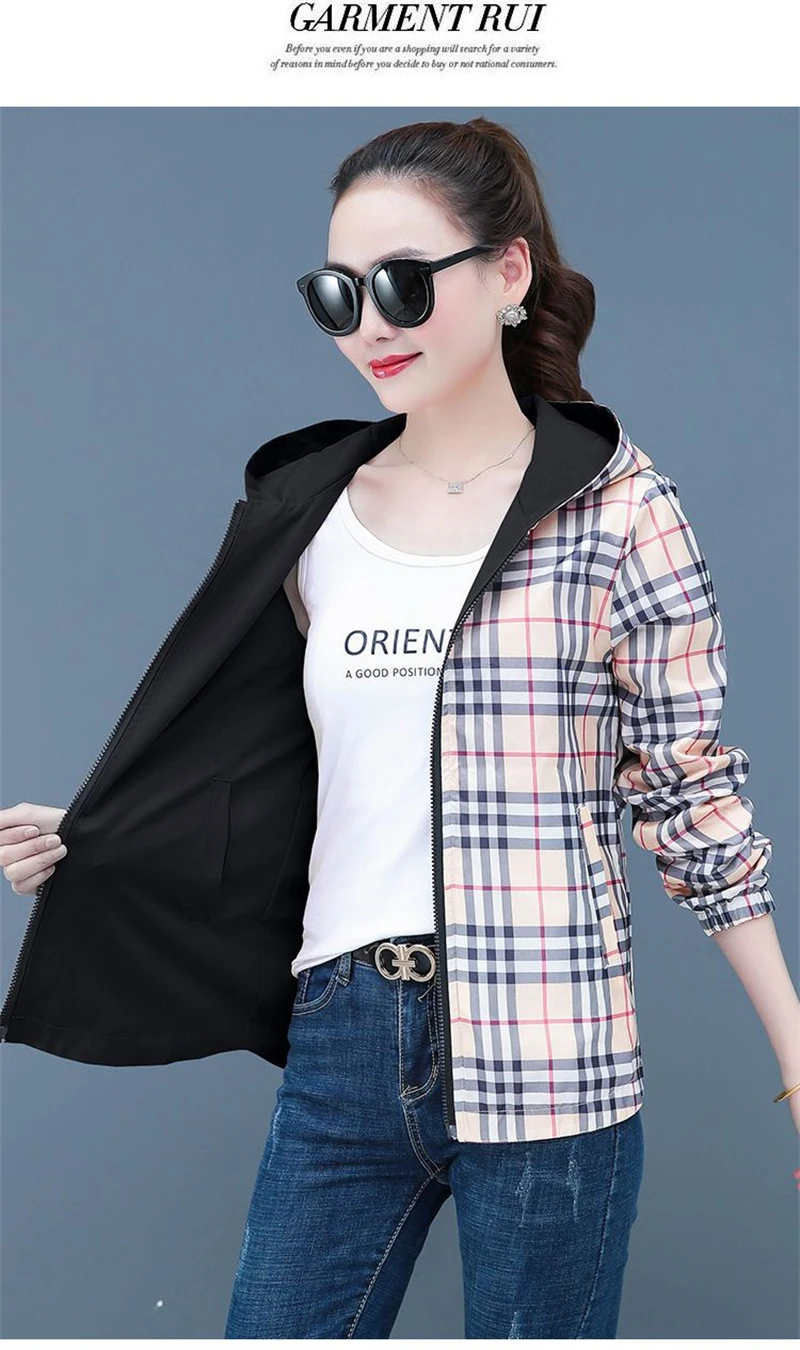 Double-Sided Trench Coat Women 2025 New Spring Autumn Clothes Letter Plaid Hooded Short Windbreaker Jacket Female Outerwear Tops