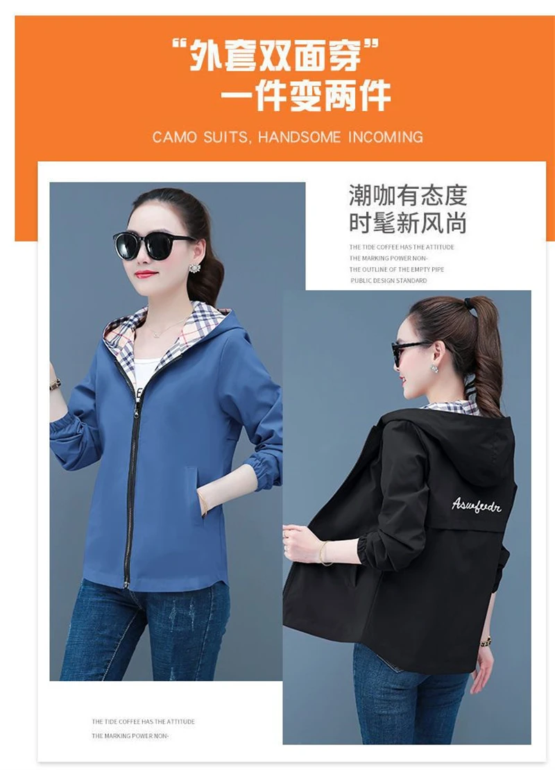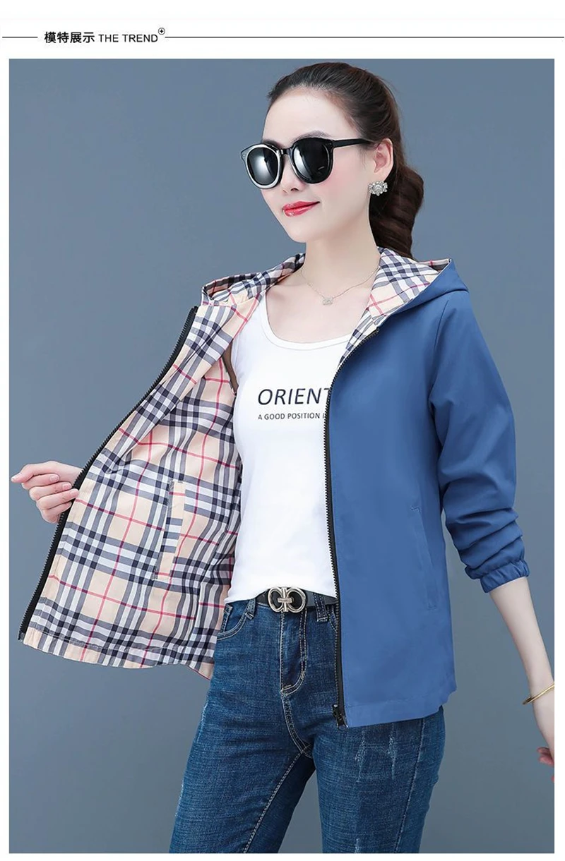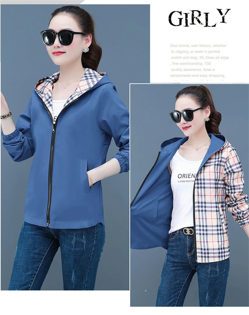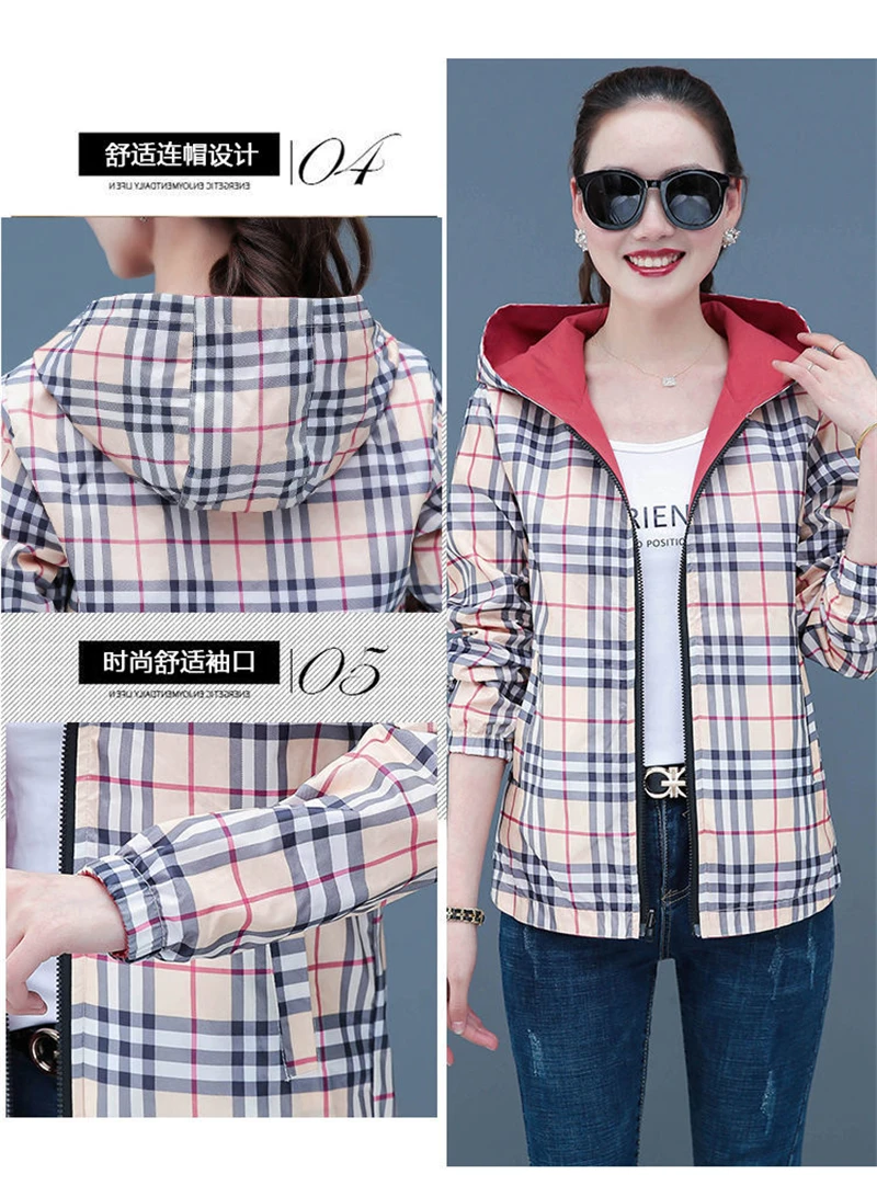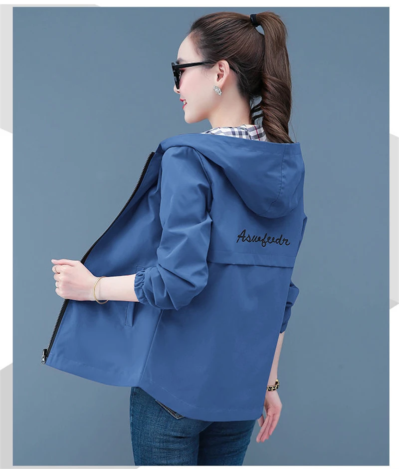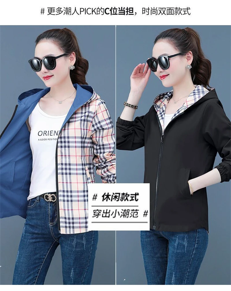 Double-Sided Trench Coat Women 2025 New Spring Autumn Clothes Letter Plaid Hooded Short Windbreaker Jacket Female Outerwear Tops