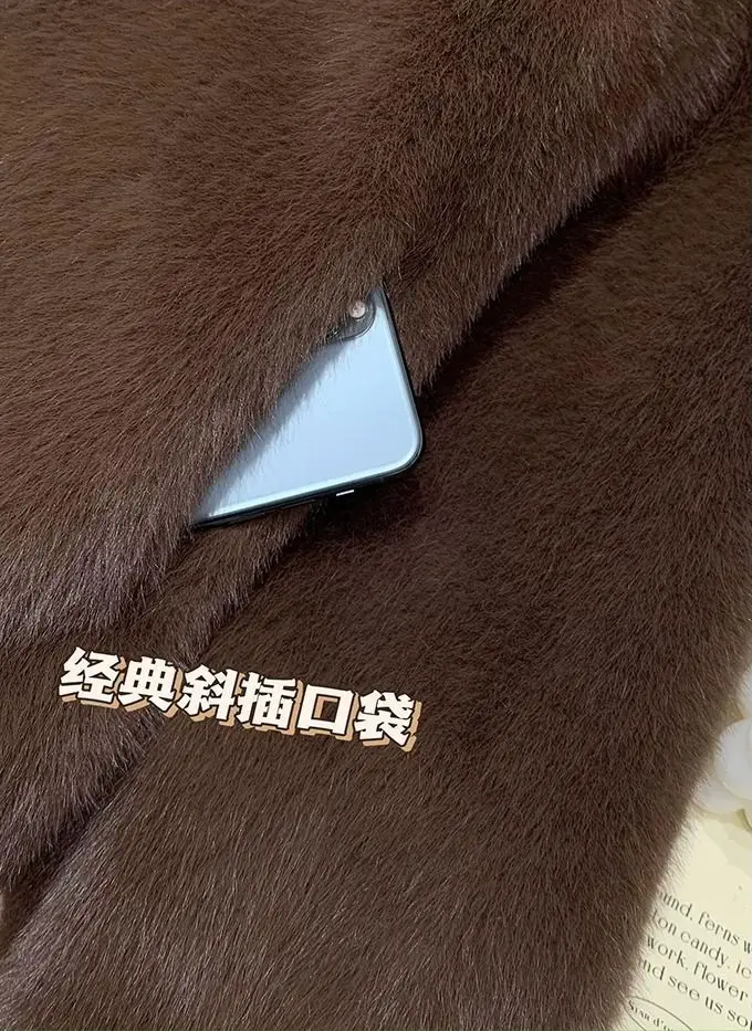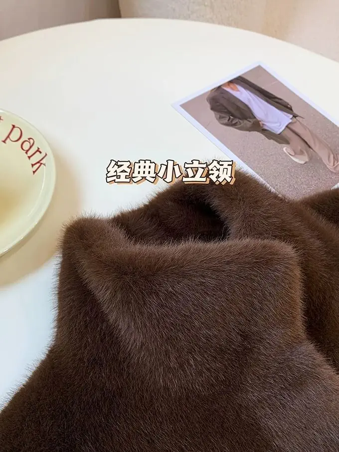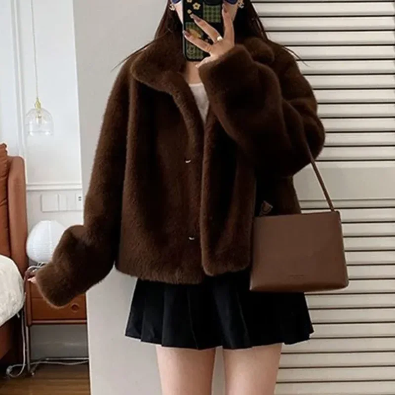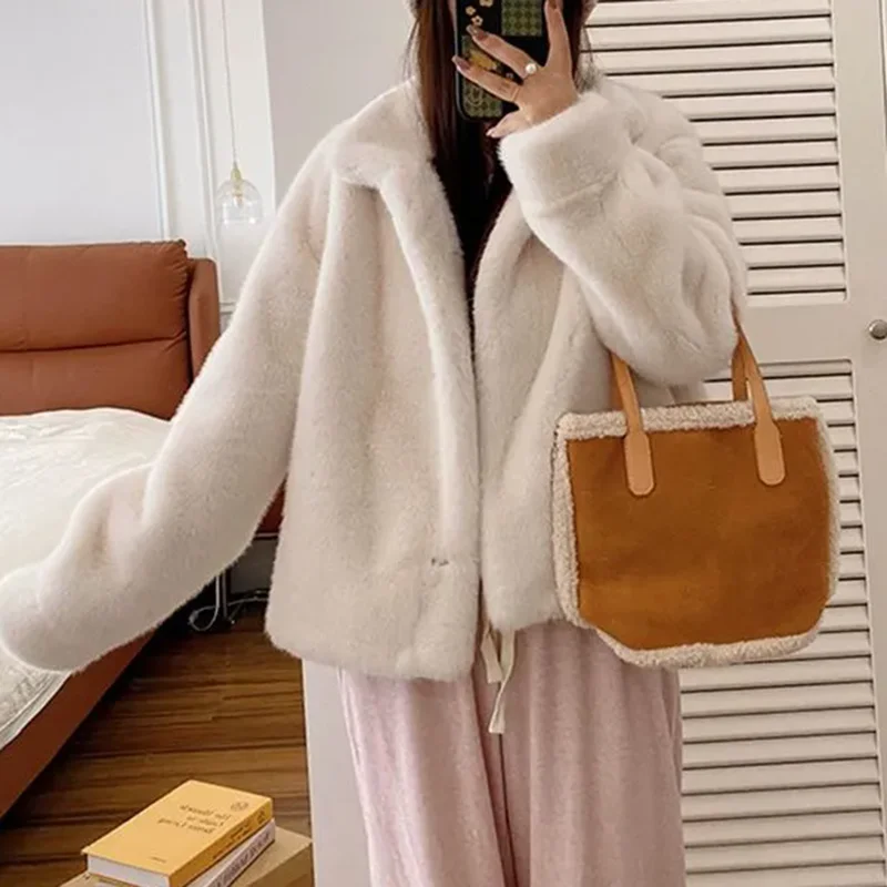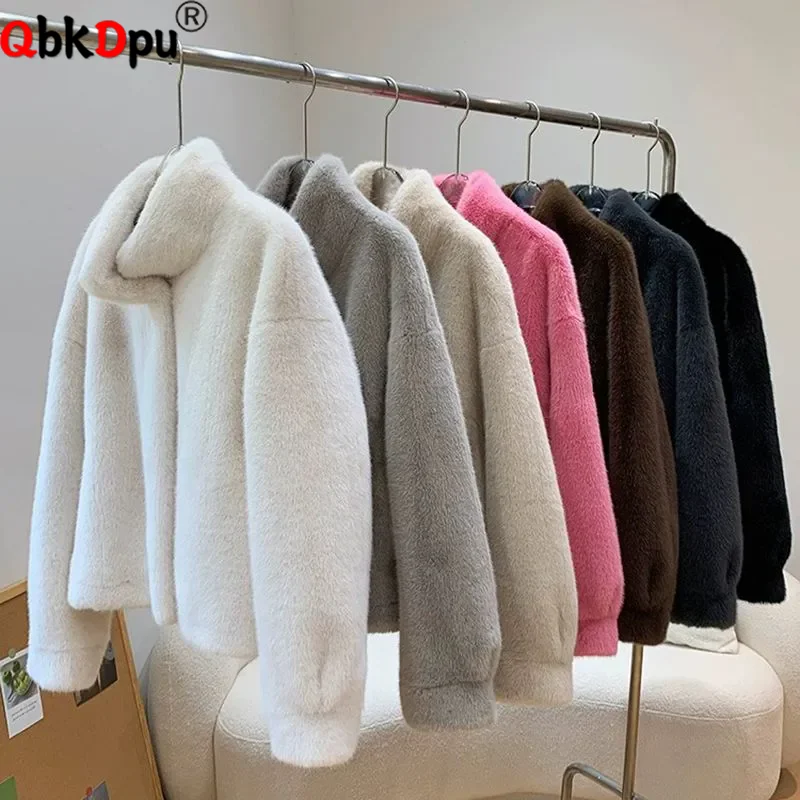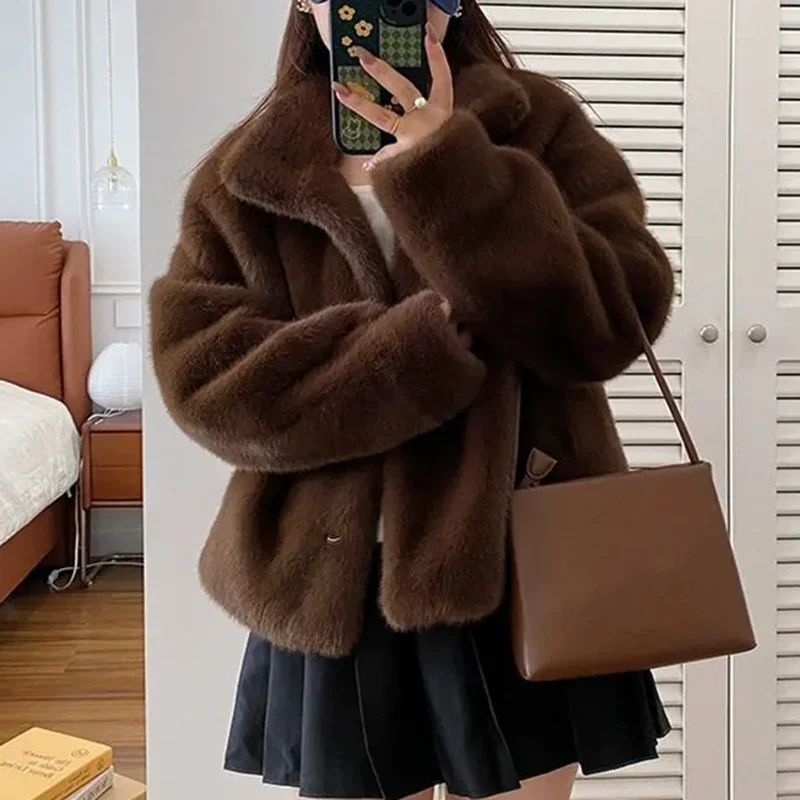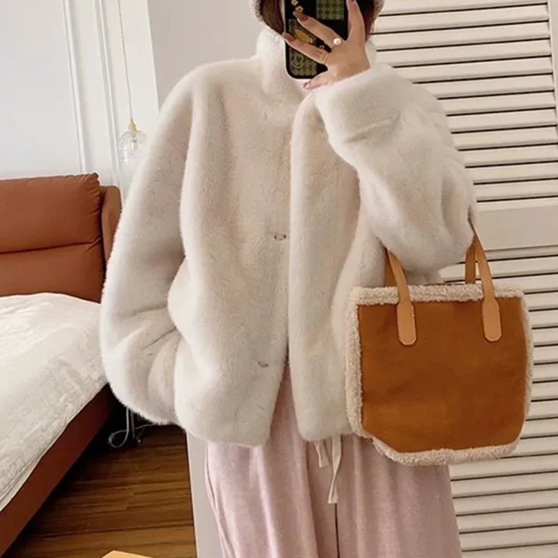 Elegant Faux Fur Loose Jackets Tops Winter Warm Stand Neck Single Breasted Coats Women Imitation Mink Fur Long Sleeve Abrigos