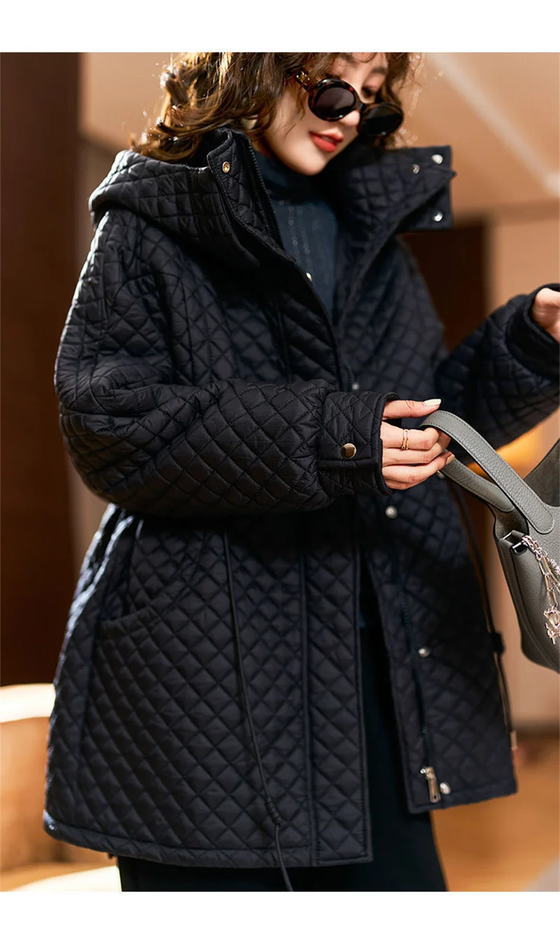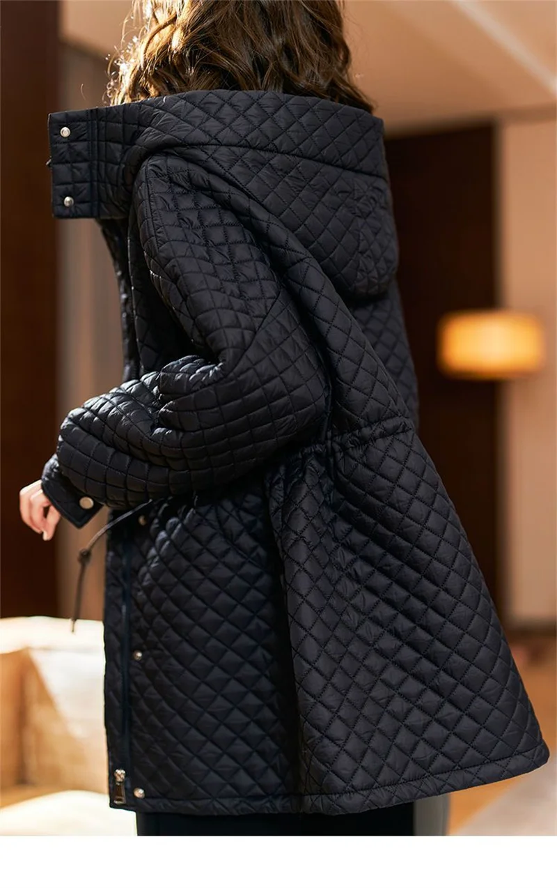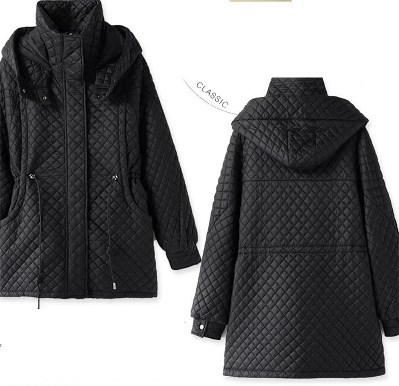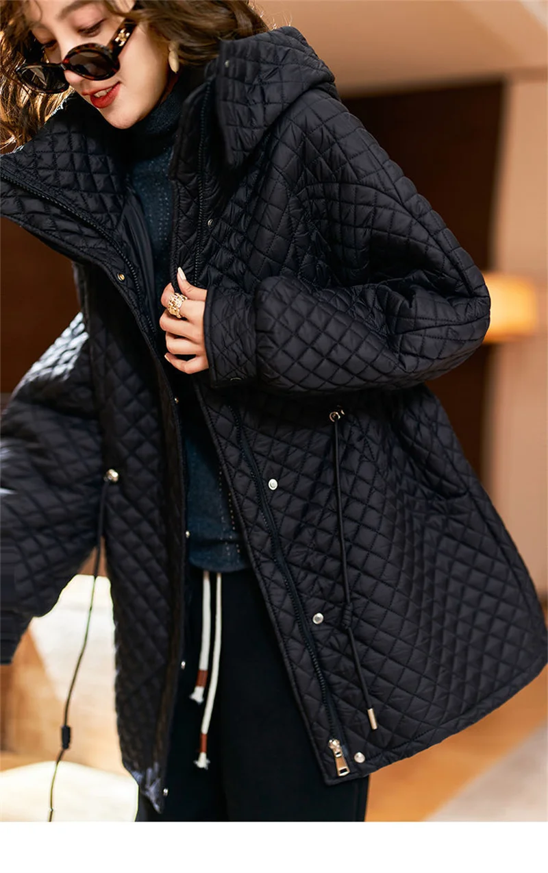 European Women's Down Cotton Jacket Fashion Rhombic Thin Spring Autumn Parkas 2025 Mid Long Coat Hooded Drawstring Outerwear