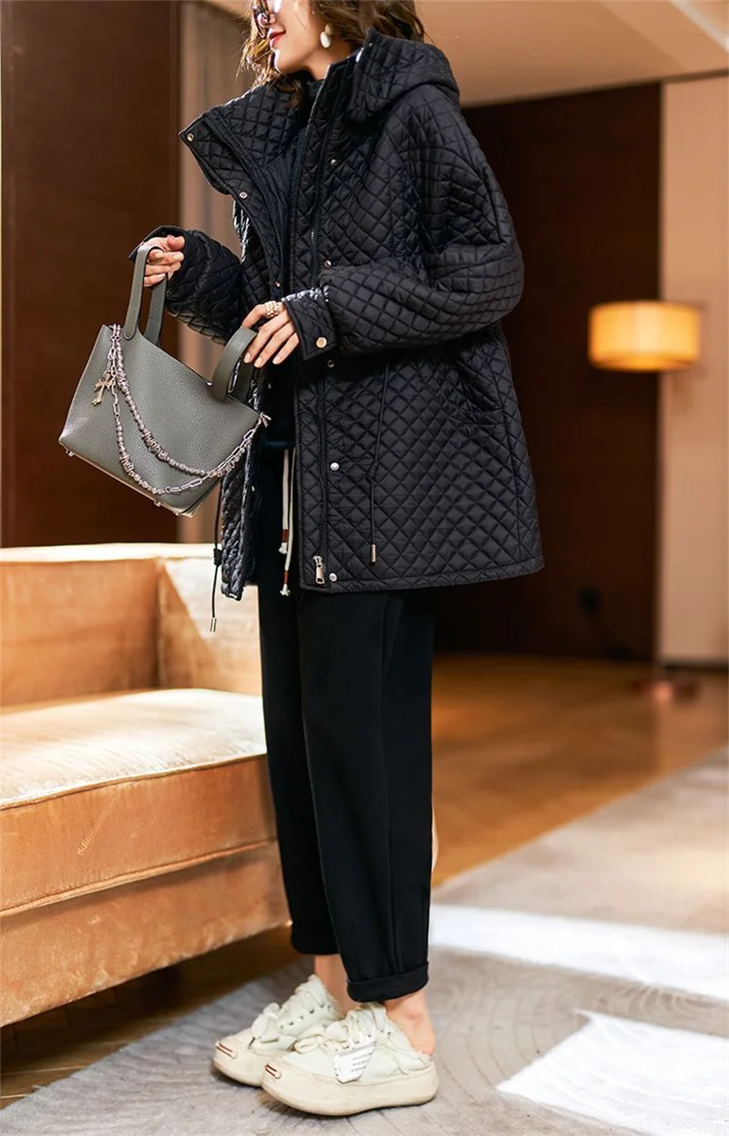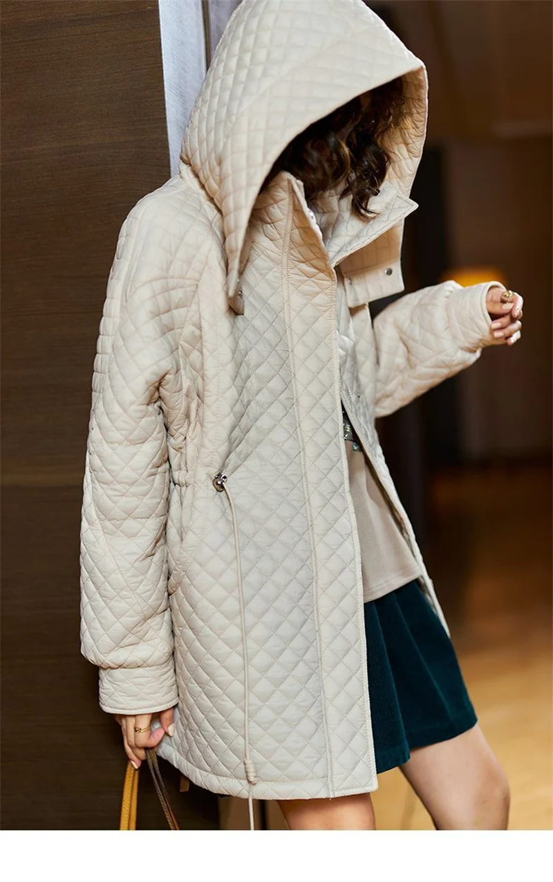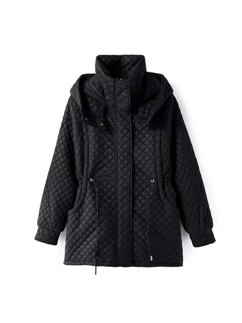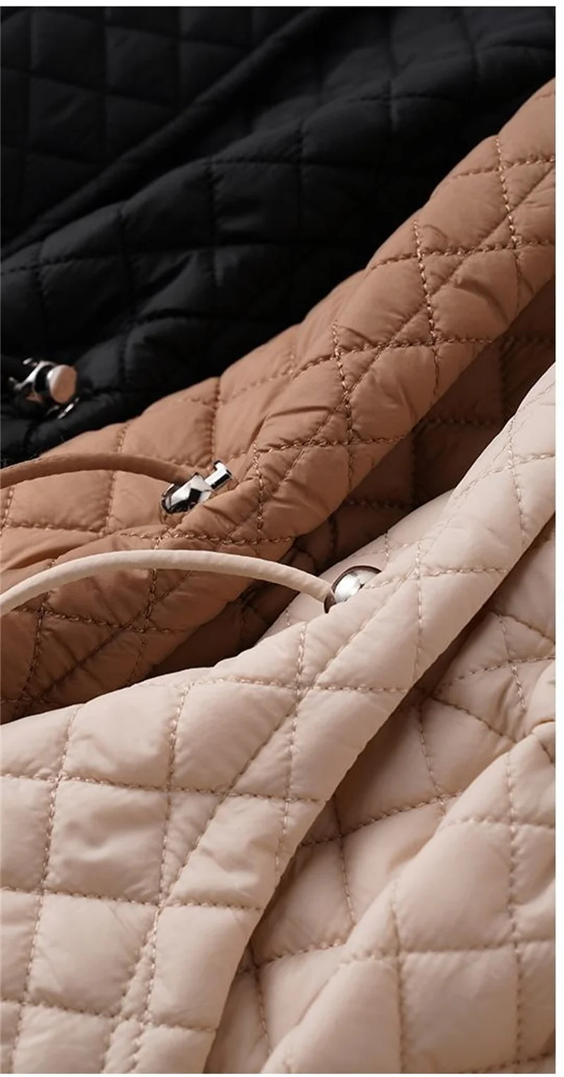 European Women's Down Cotton Jacket Fashion Rhombic Thin Spring Autumn Parkas 2025 Mid Long Coat Hooded Drawstring Outerwear