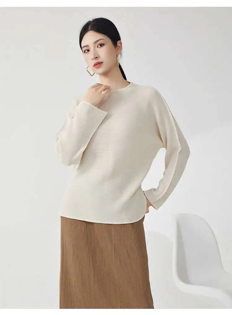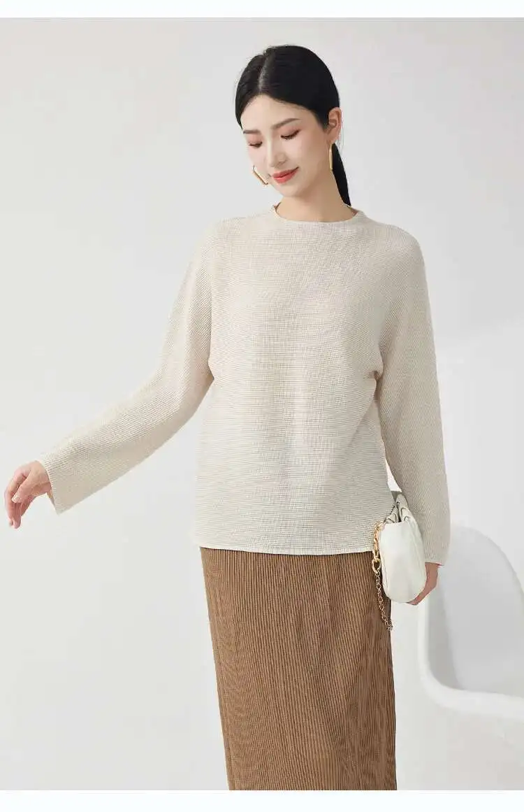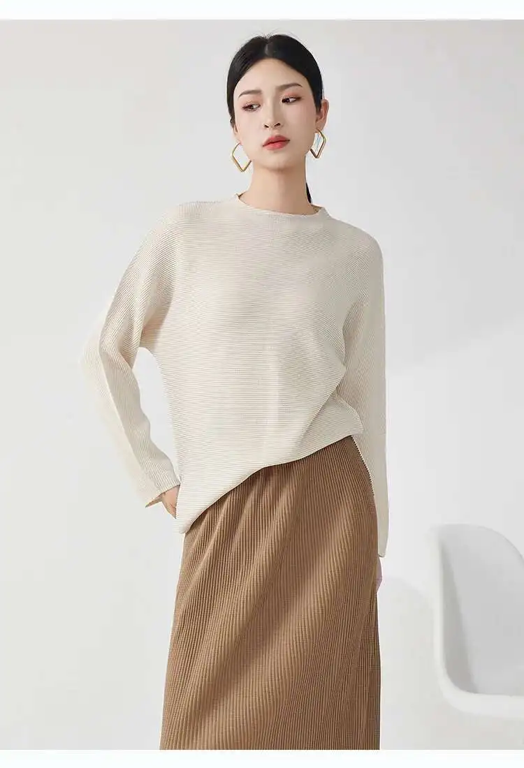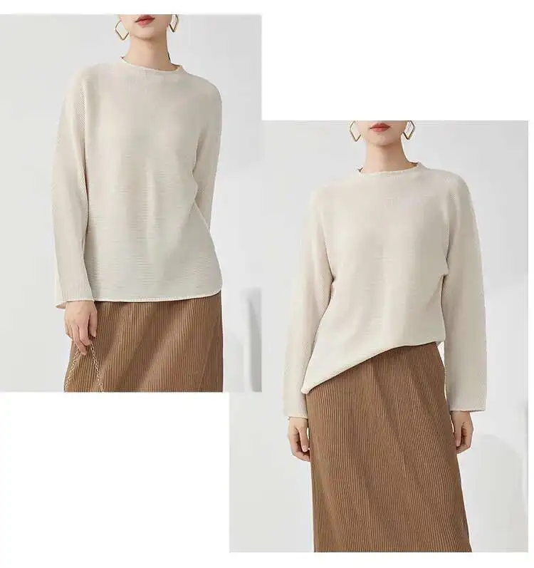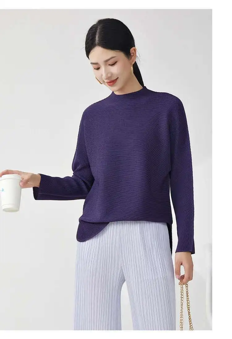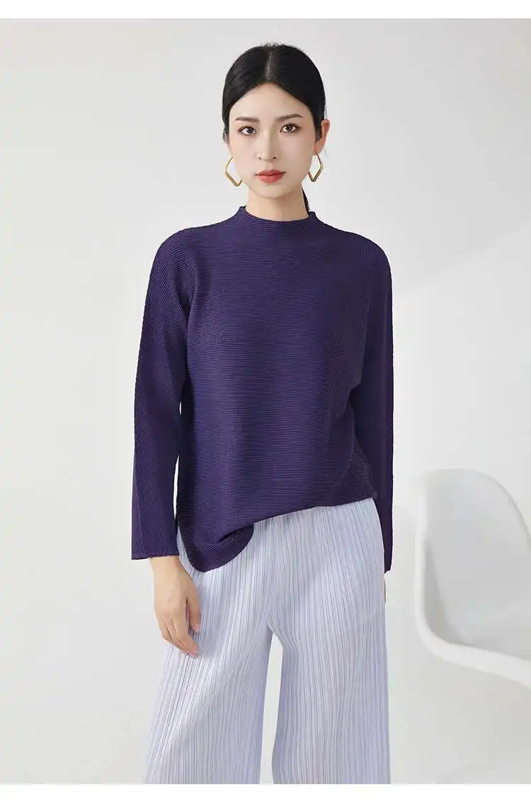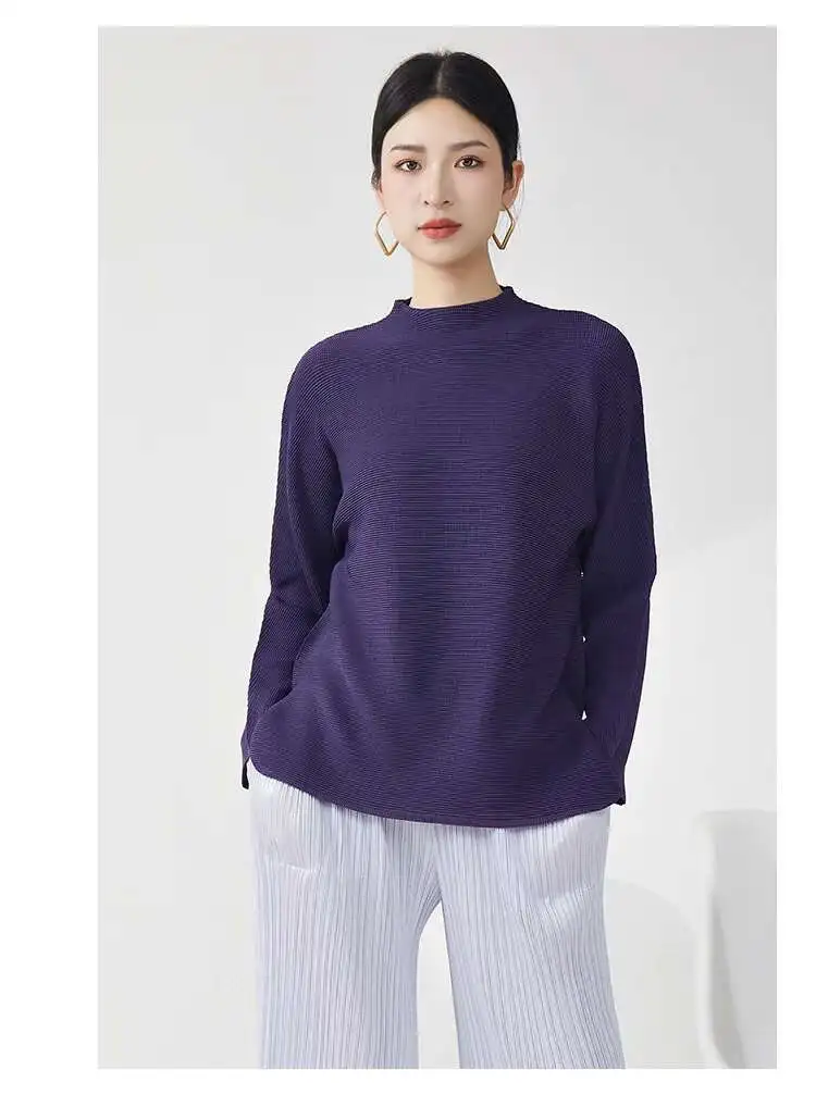 GVUW Pleated Loose T Shirt For Women Stand Collar Full Sleeve Solid Color Pullover New 2025 Spring Female Clothing 17G9891