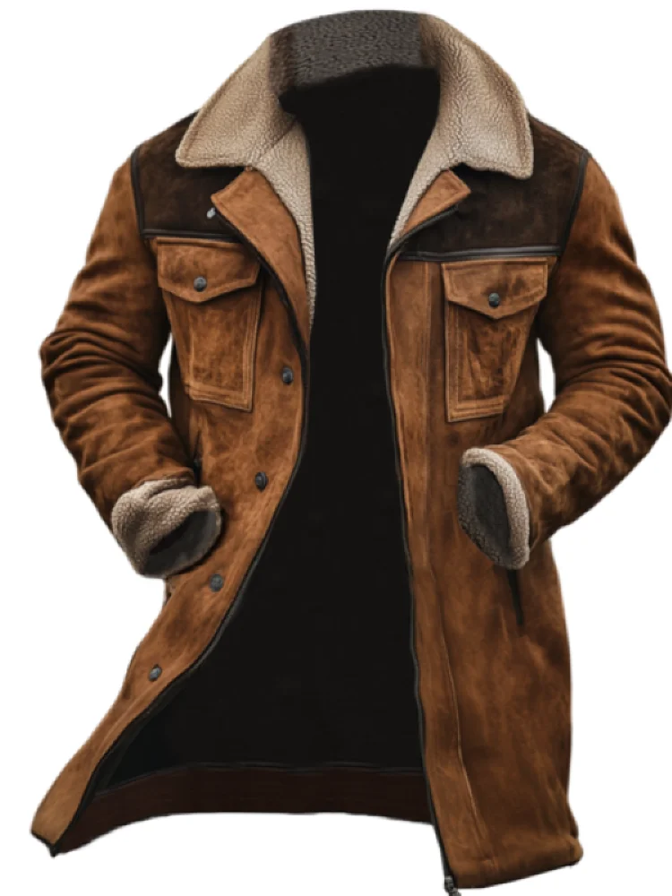 Men's Vintage Suede Patchwork Lamb Fleece Multi-Pocket Reverse Collar Outdoor Jacket Coat