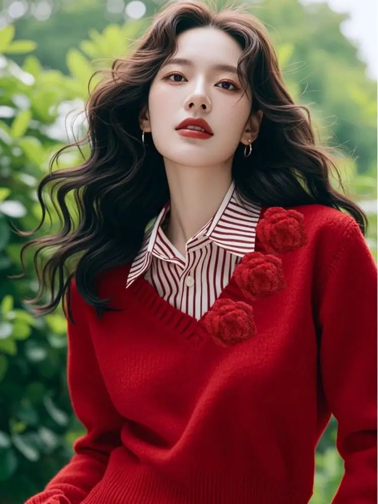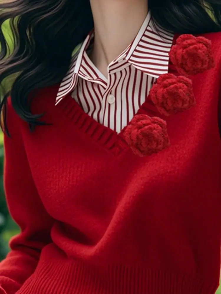 Red Rose Three-dimensional Flower Sweater Women's Clothing 2025 Autumn Winter Fake Two-piece Spliced Shirt Collar Knitted Top