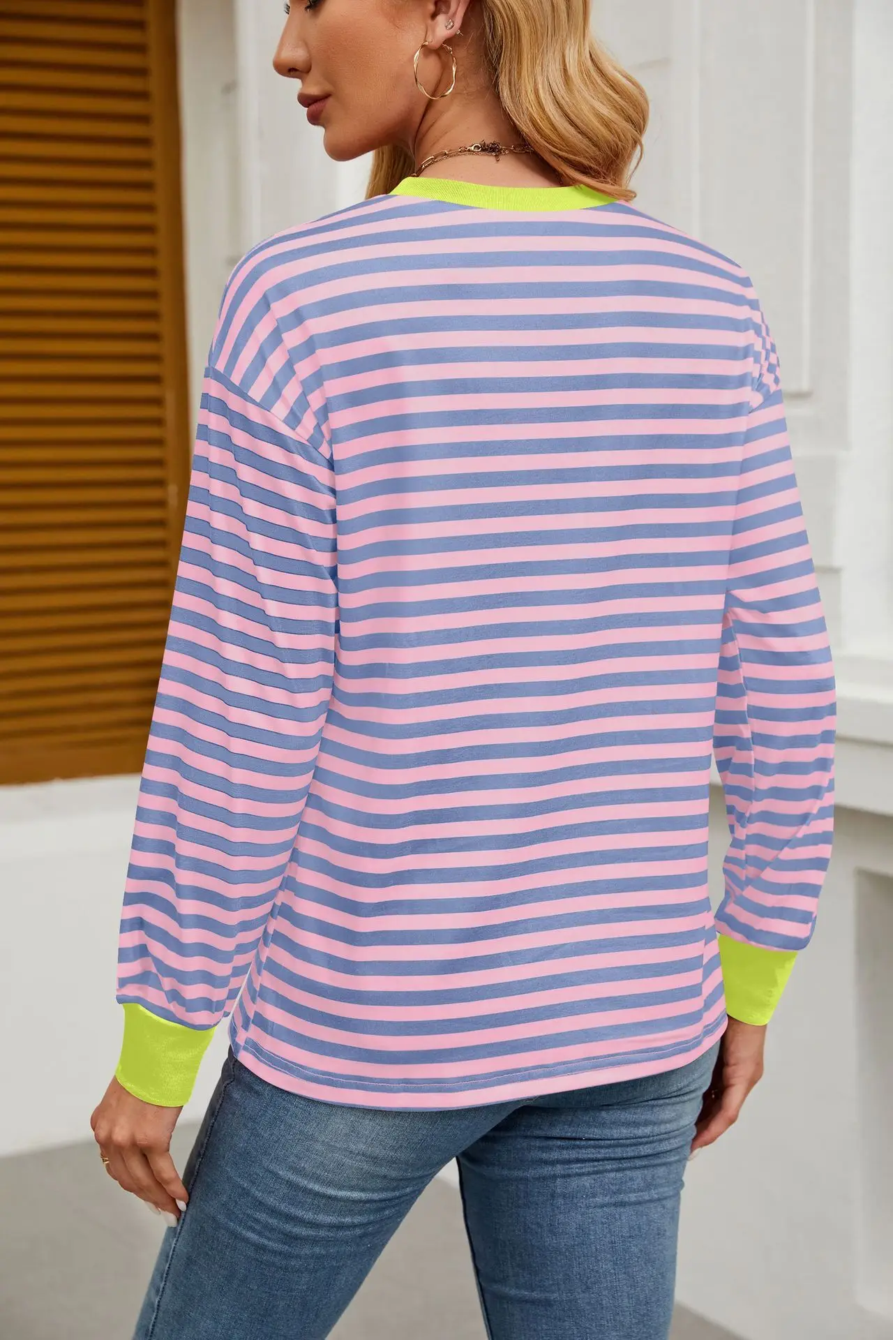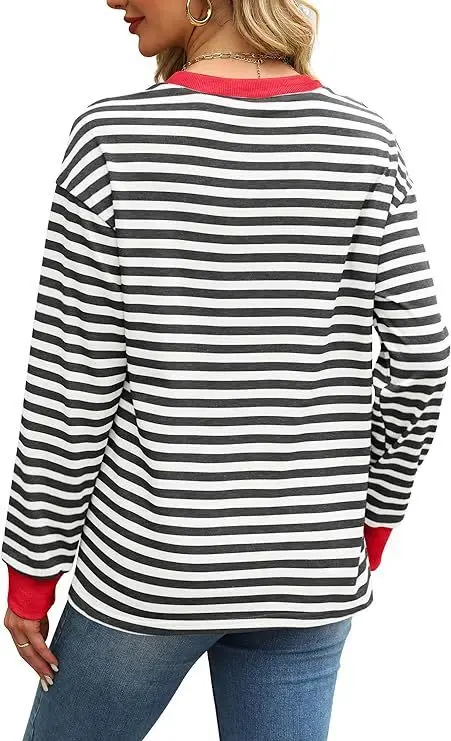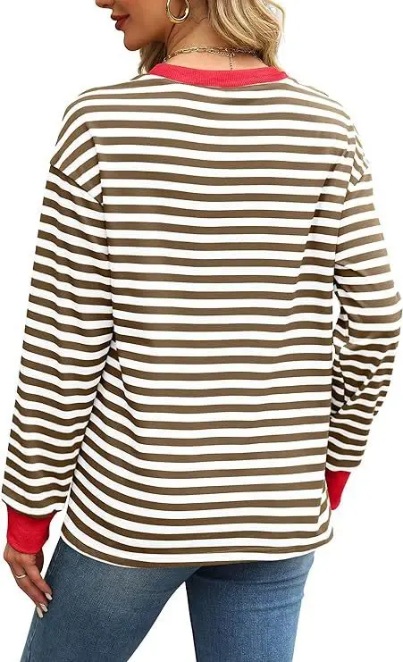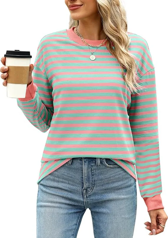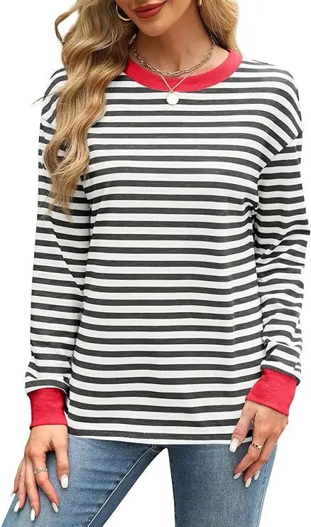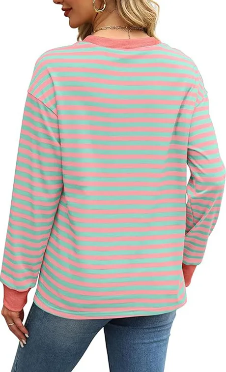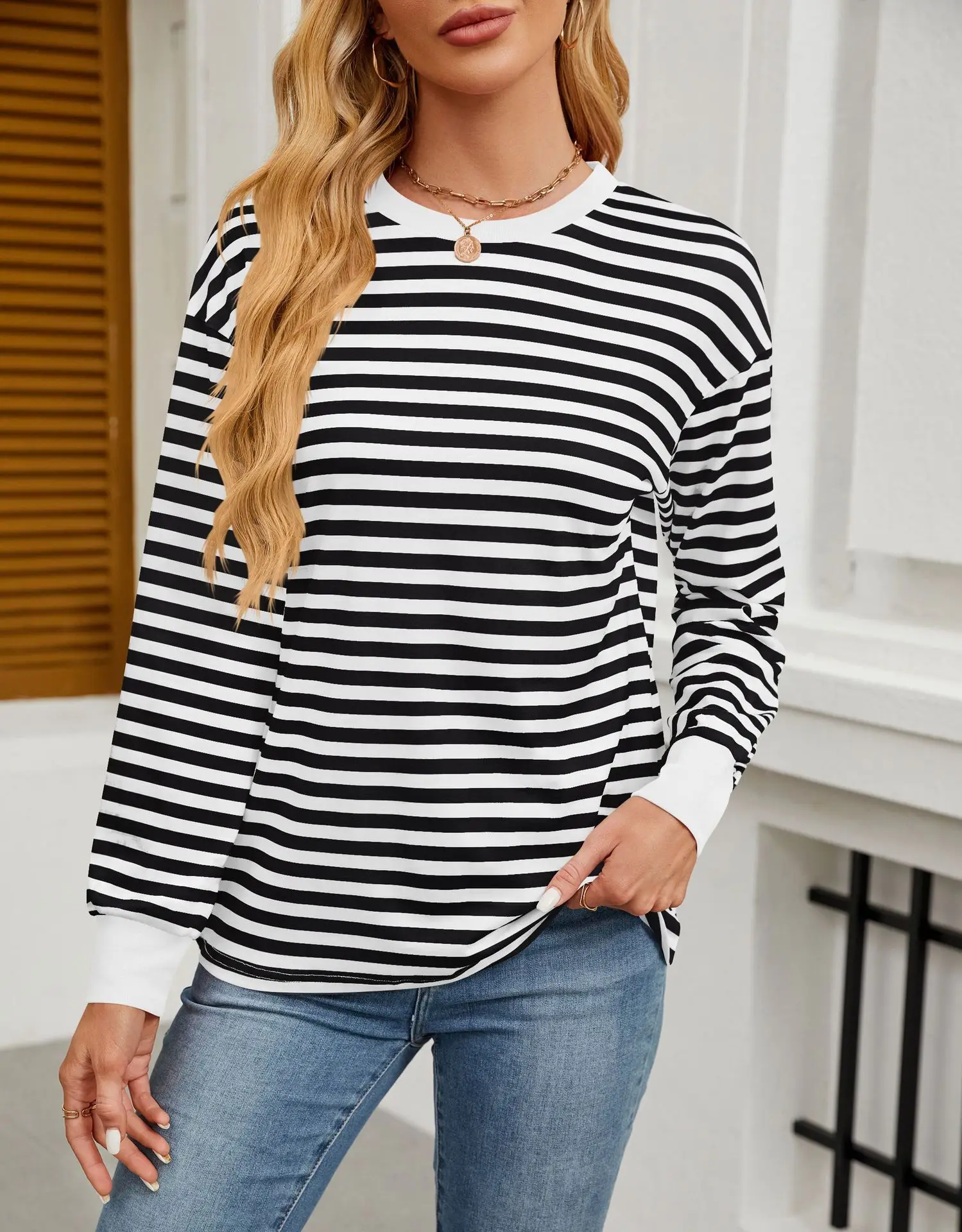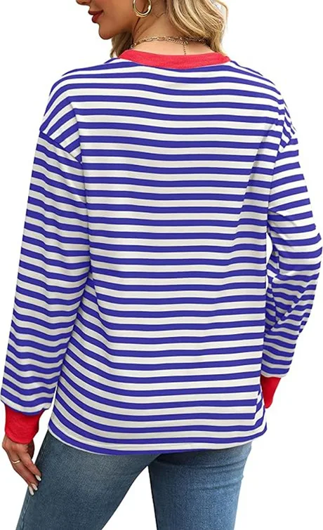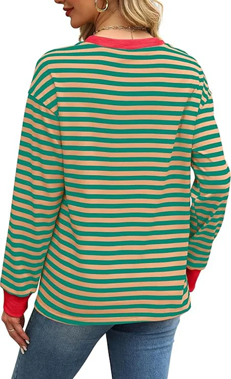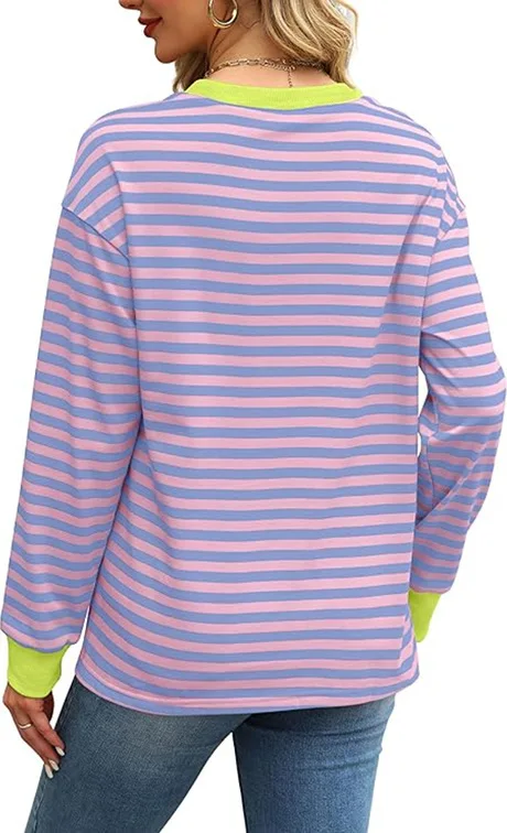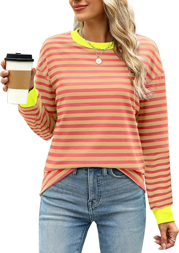 Spring Autumn Women's Round Neck Long Sleeve Color Block Loose Striped T-shirt Pullover Top