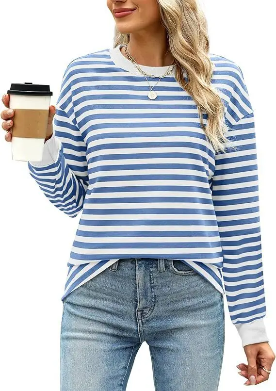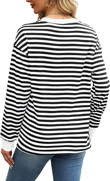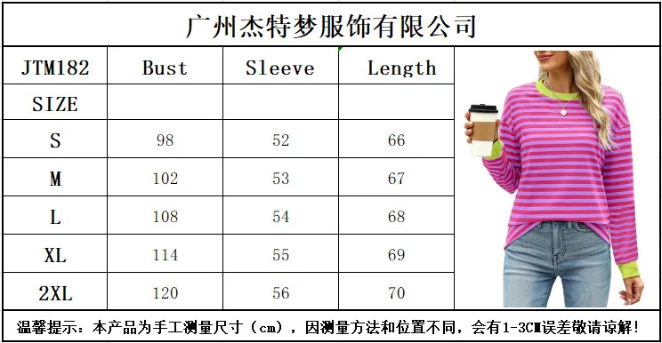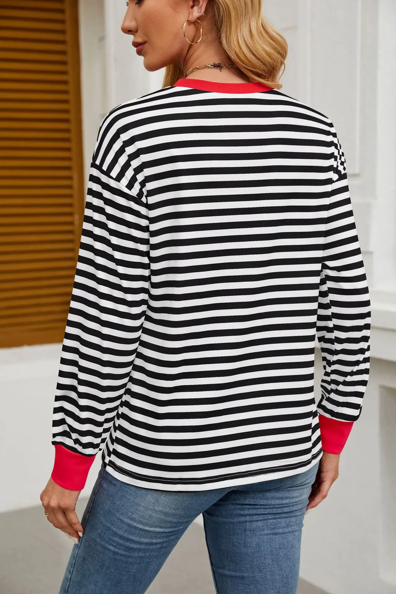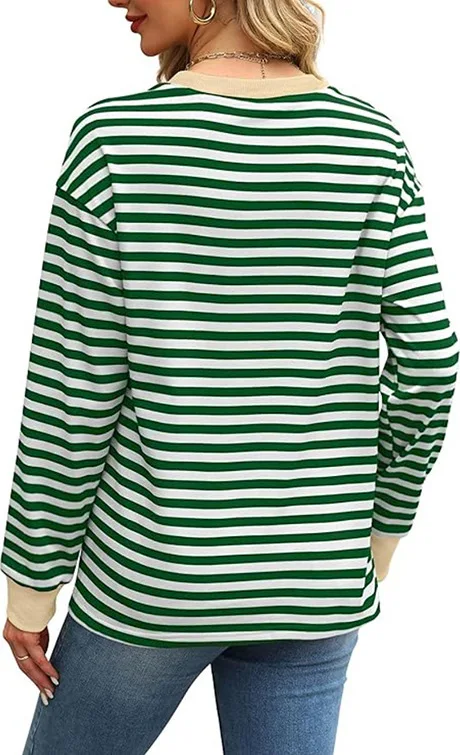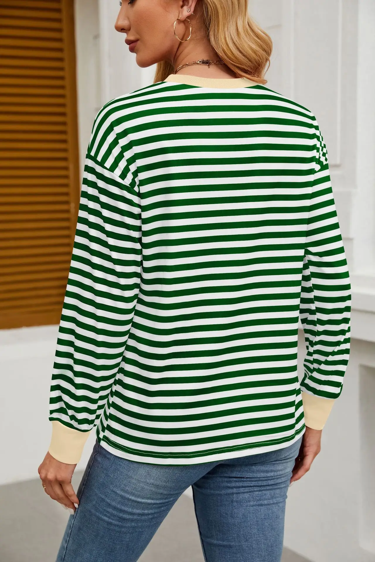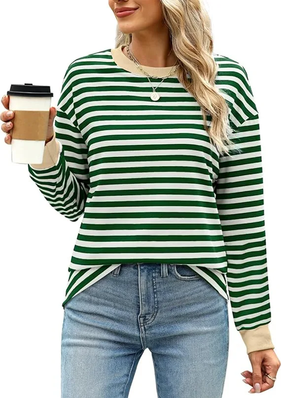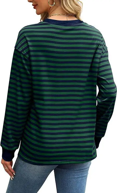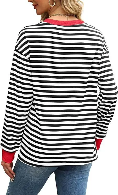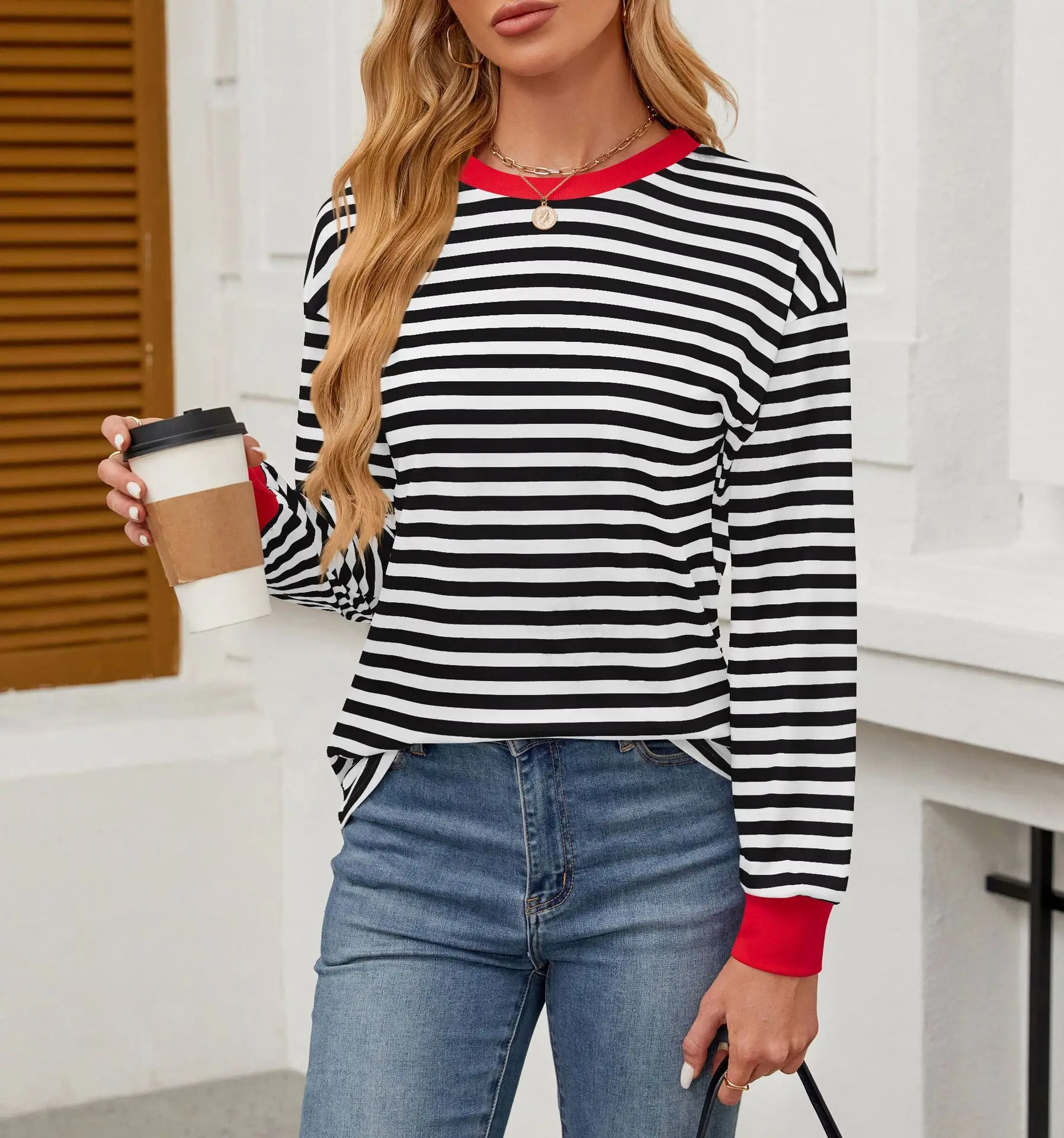 Spring Autumn Women's Round Neck Long Sleeve Color Block Loose Striped T-shirt Pullover Top
