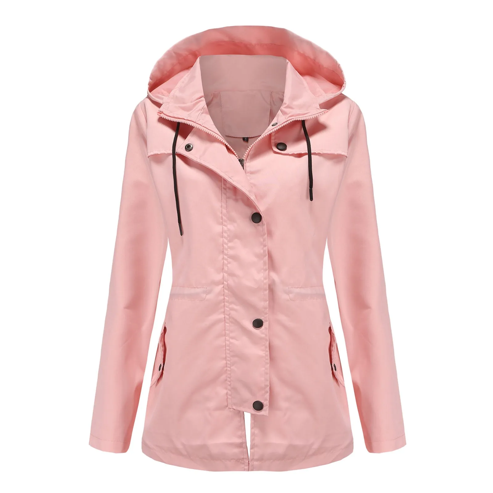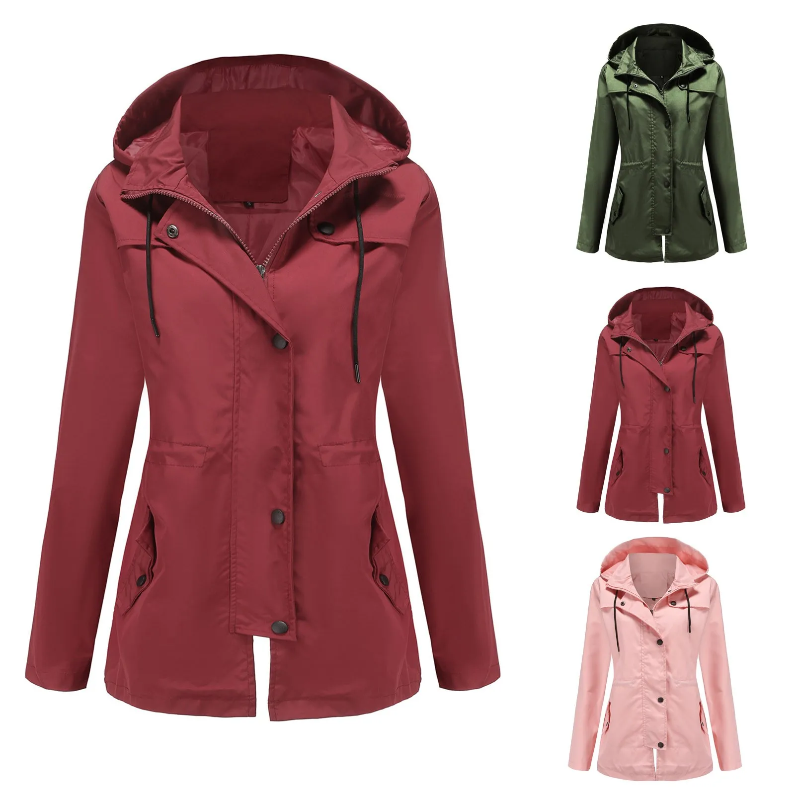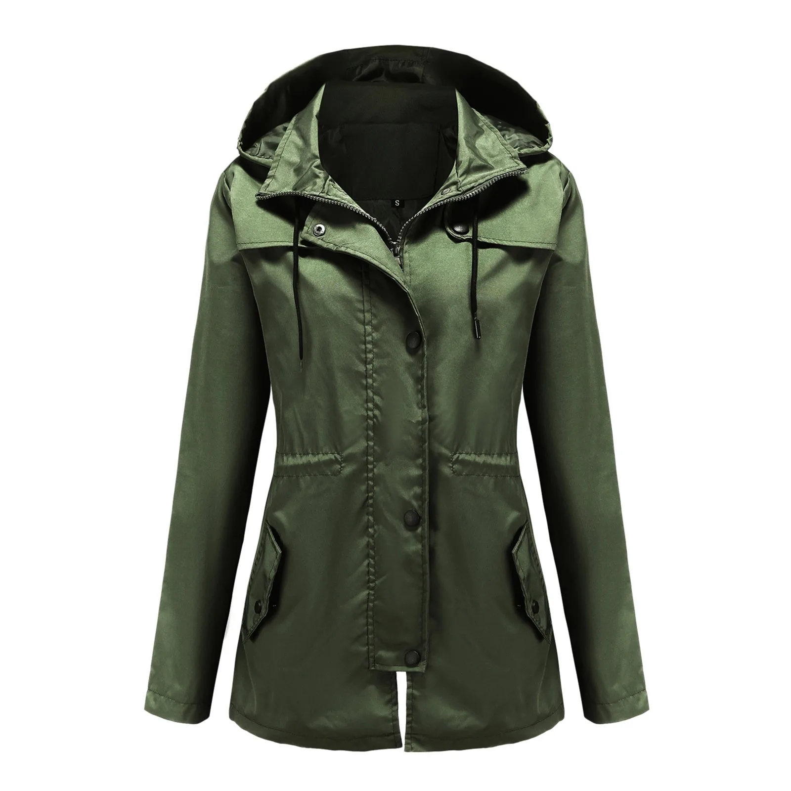 Trendy Button Front Women'S Coat Slim Drawstring Windbreaker Running Camping Women Softshell Water Proof Jacket Plus Size