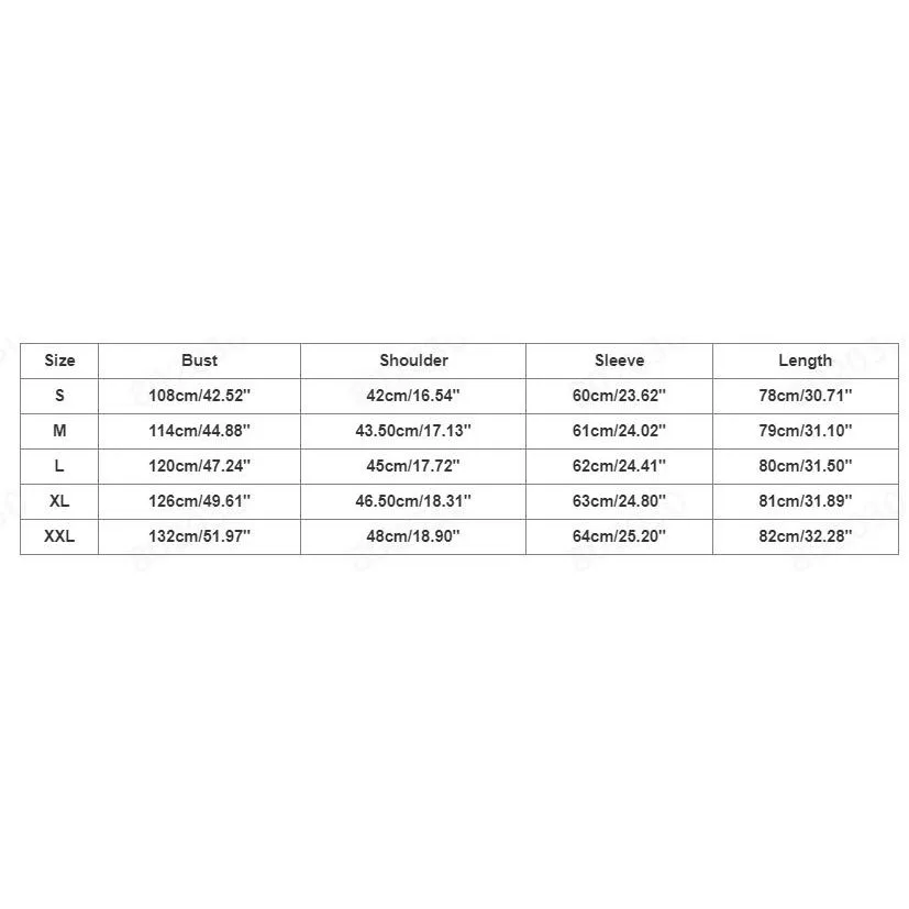 | Size:XXL | Bust:132cm/51.97'' | Shoulder:48cm/18.90'' | Sleeve:64cm/25.20'' | Length:82cm/32.28'' |