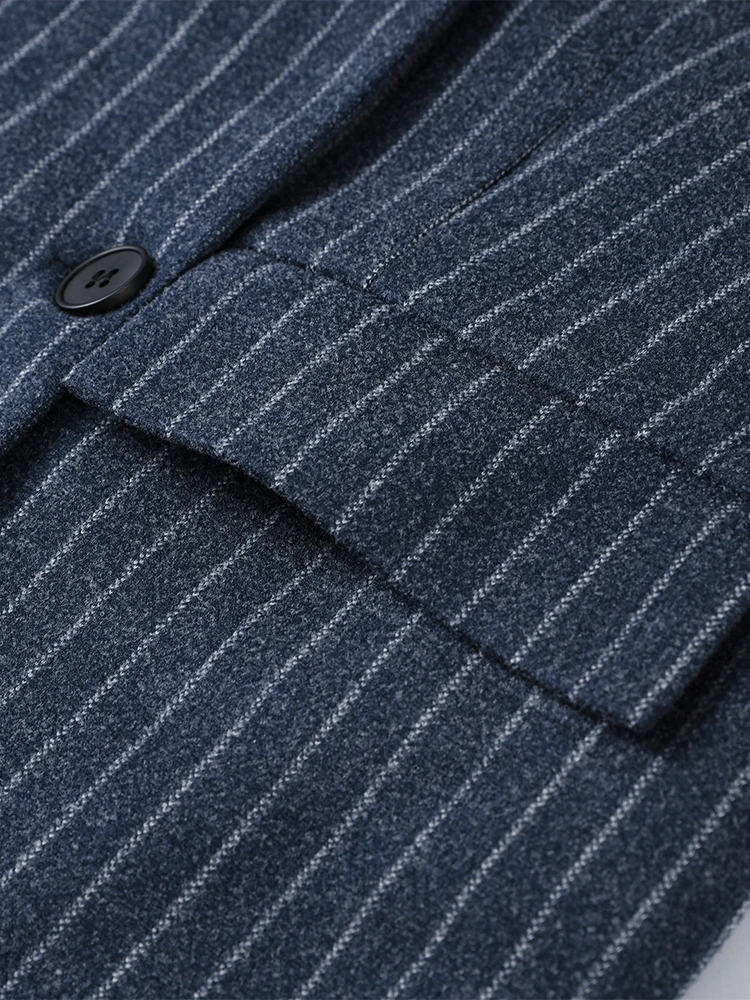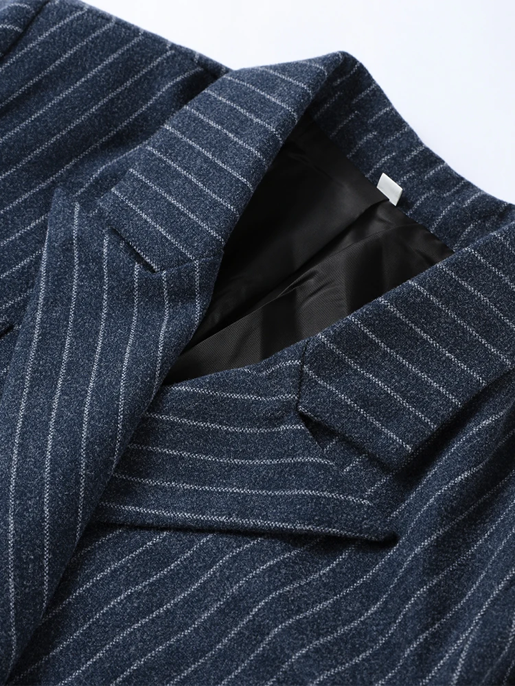 This coat features a refined pinstripe pattern and a tailored fit, exuding an air of sophistication. Its maxi length adds a touch of elegance, making it a standout piece for any occasion.