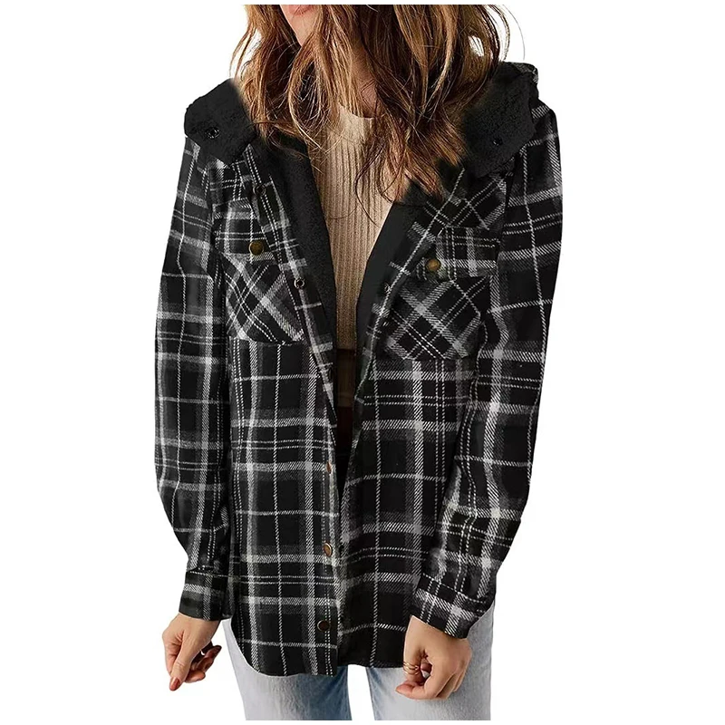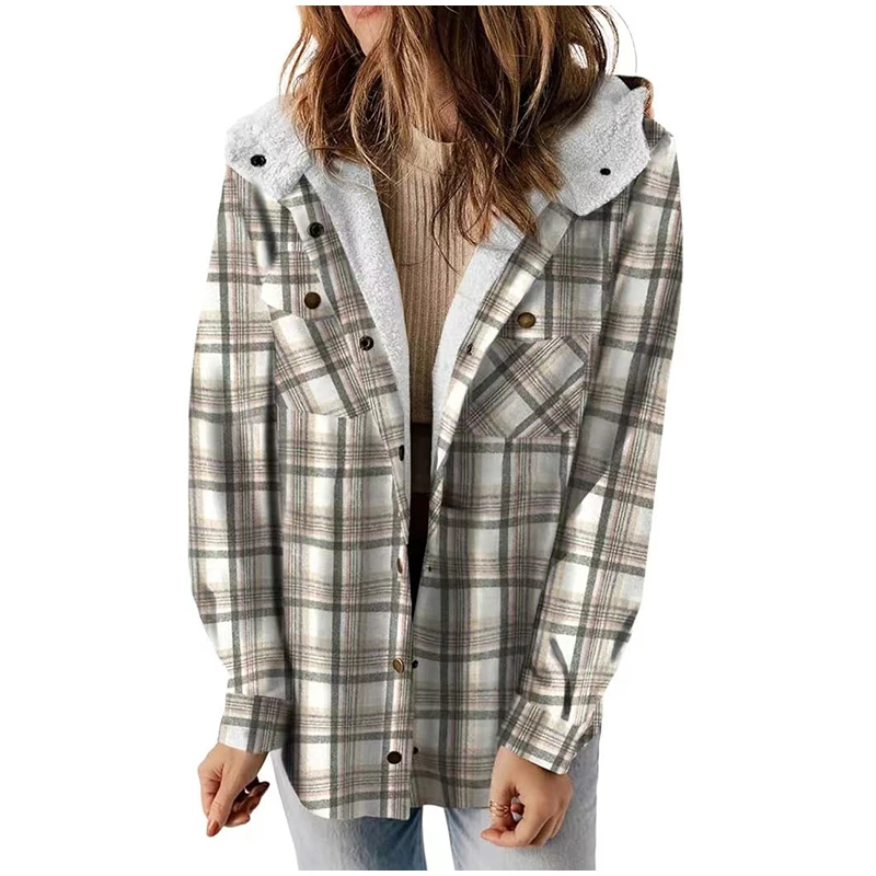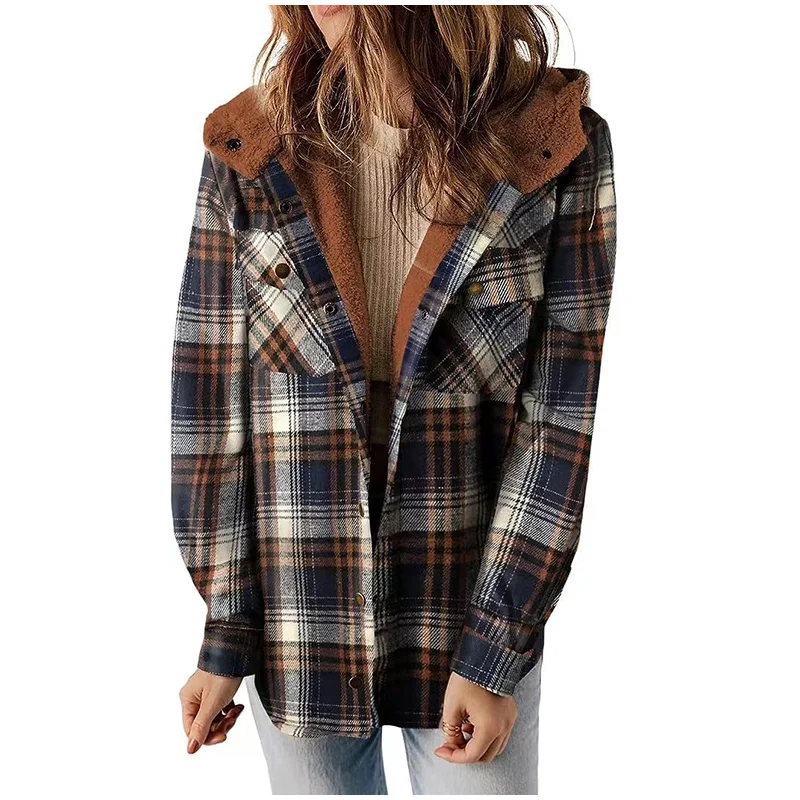 Vintage Plaid Thicken Hooded Jackets Women Laple Patchwork Button Pockets Long Sleeve Female Coats 2026 Autumn Lady Streetwears