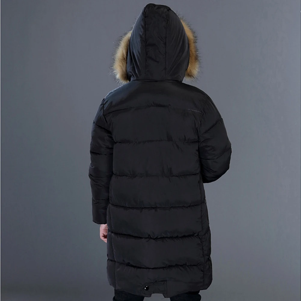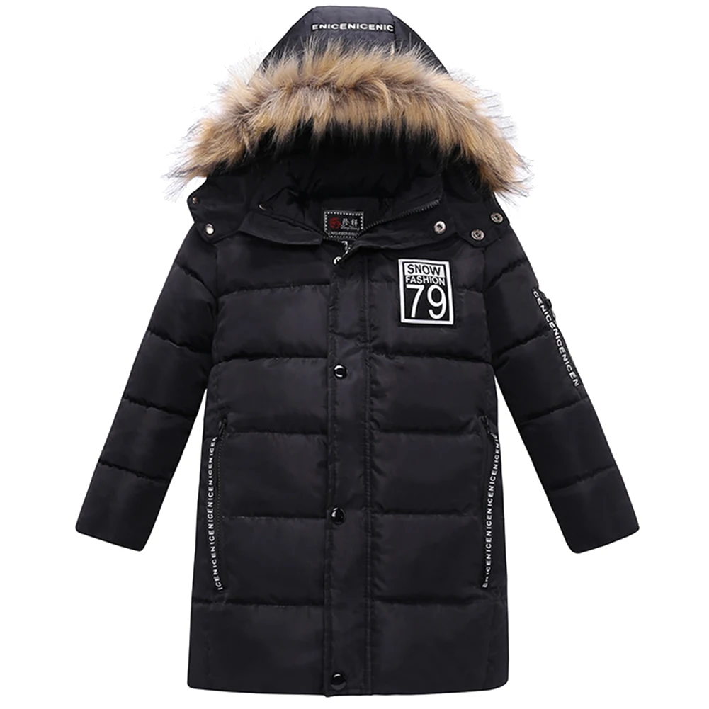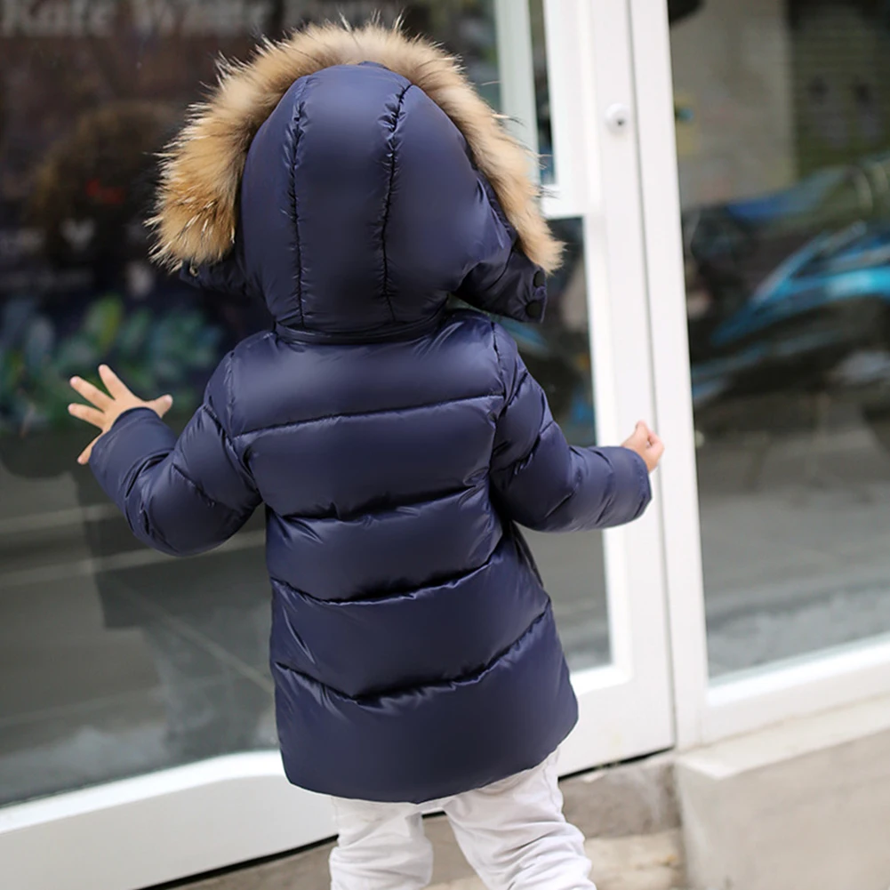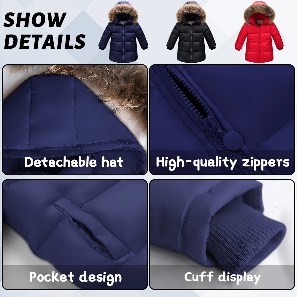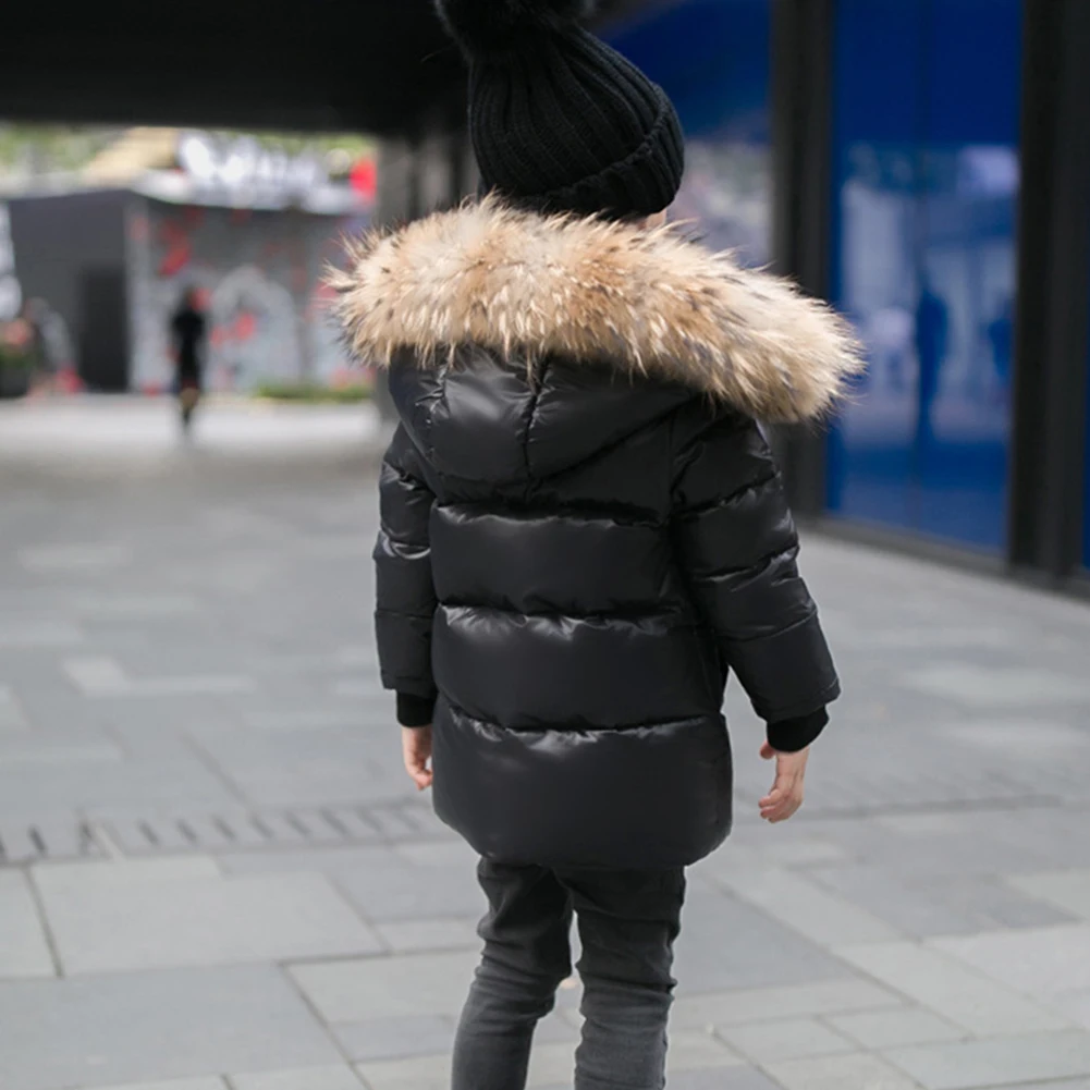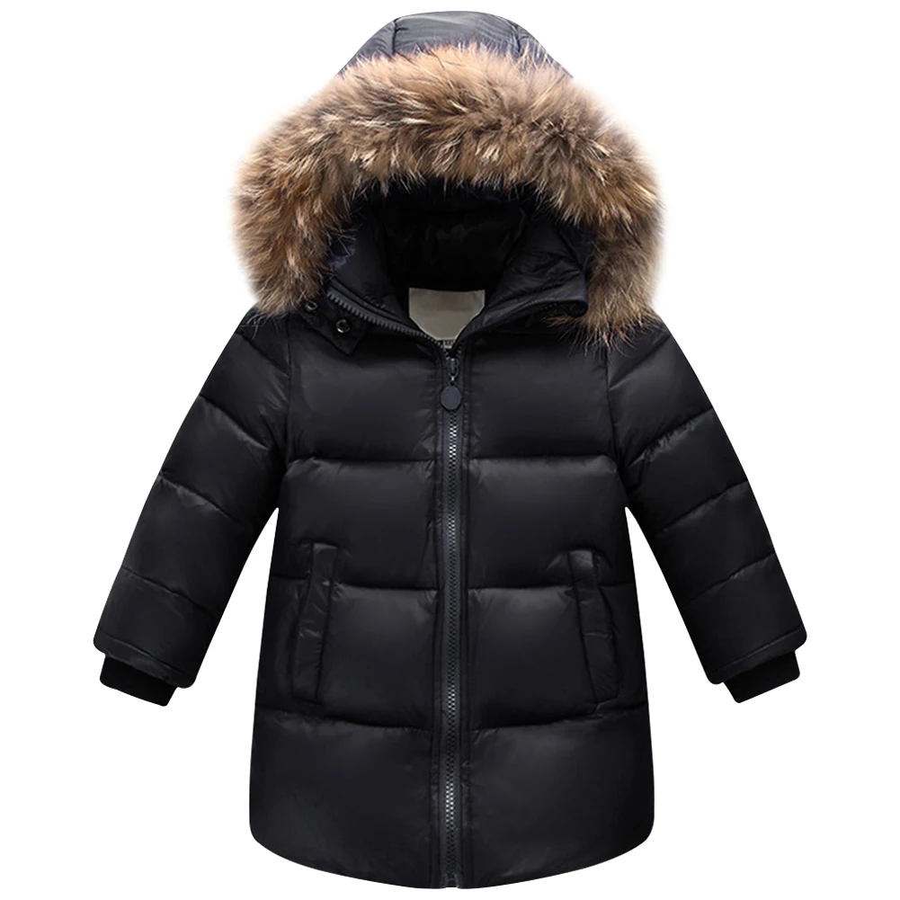 Winter Children's Down Jacket Boys Girls Cotton Padded Coat with Full Zipper Warm Long Fur Hood Windproof Kids Overcoat Parka