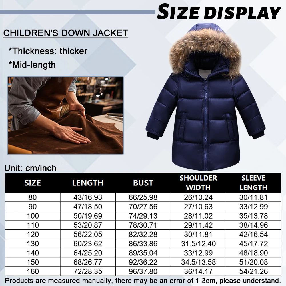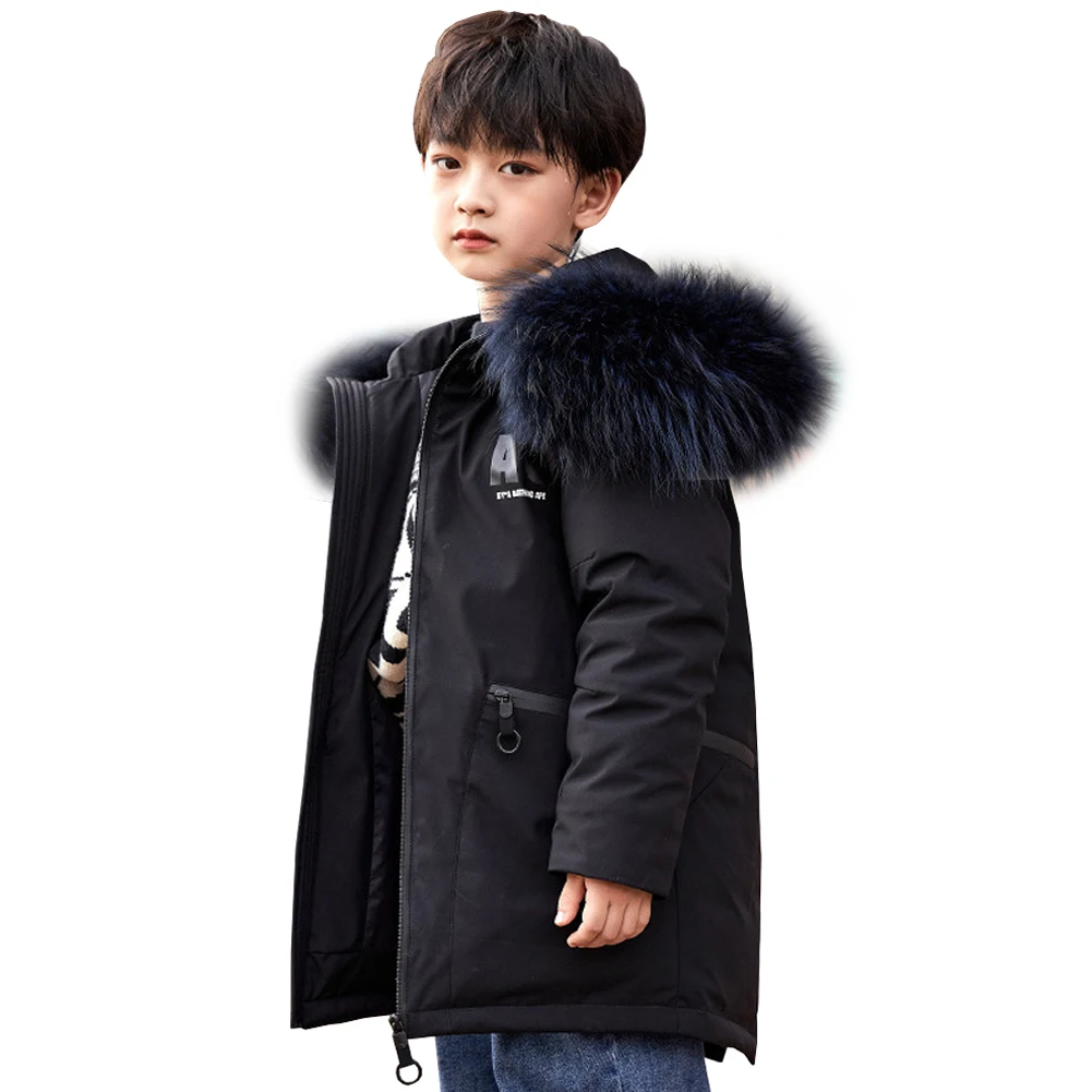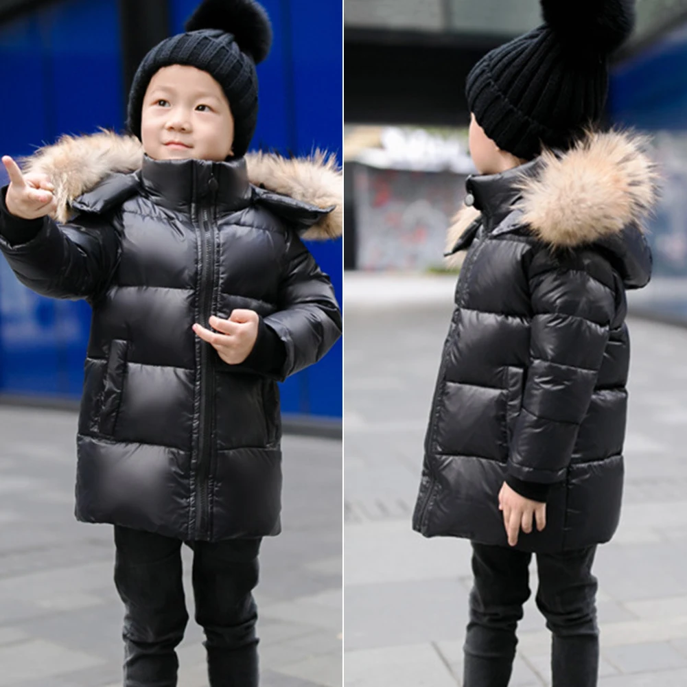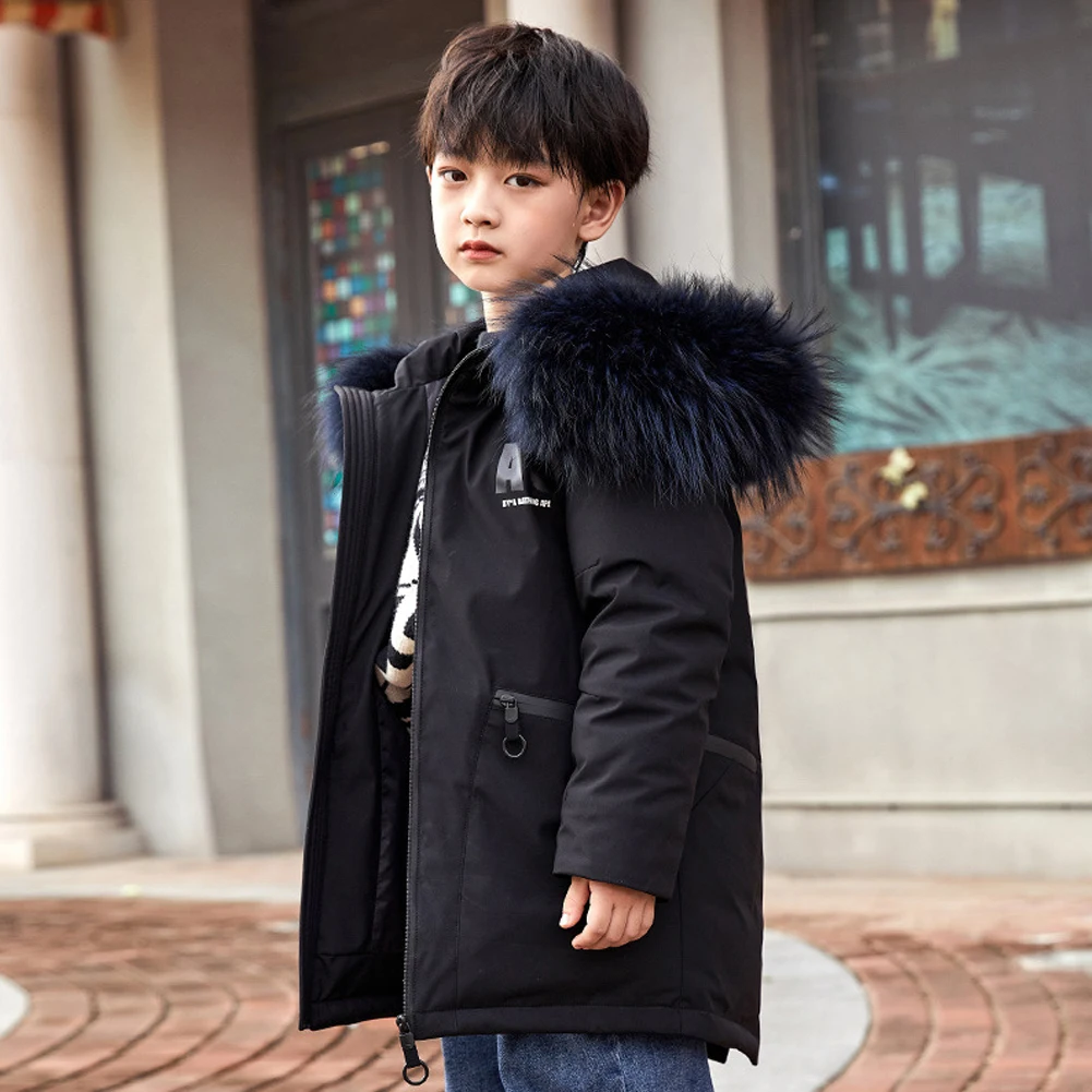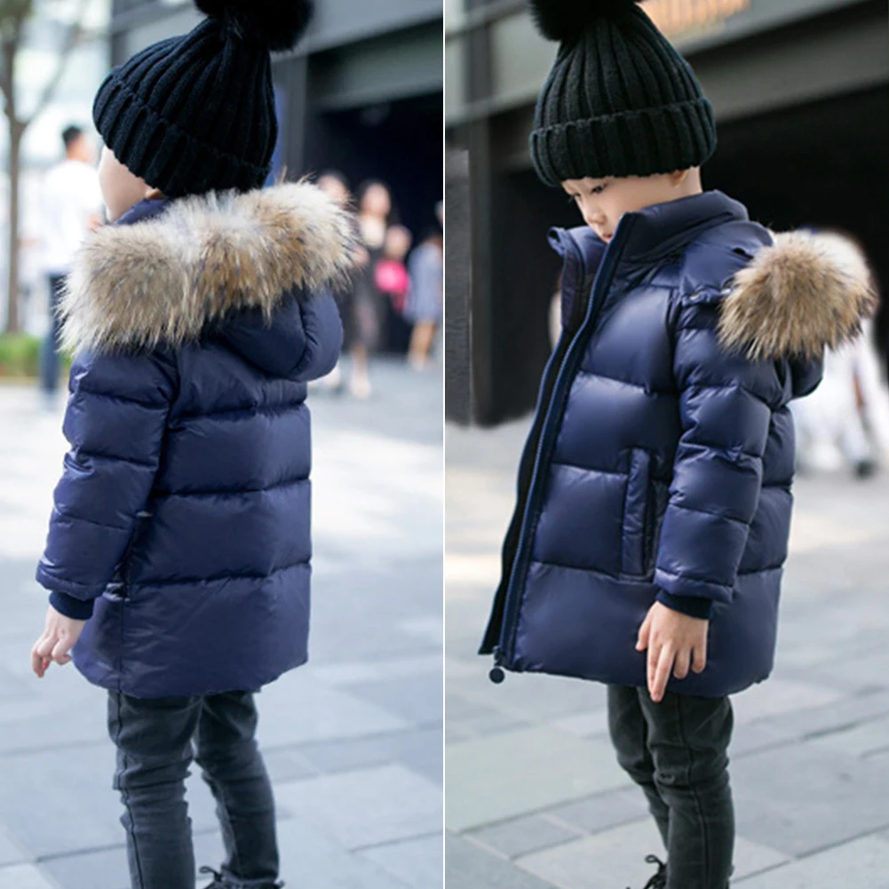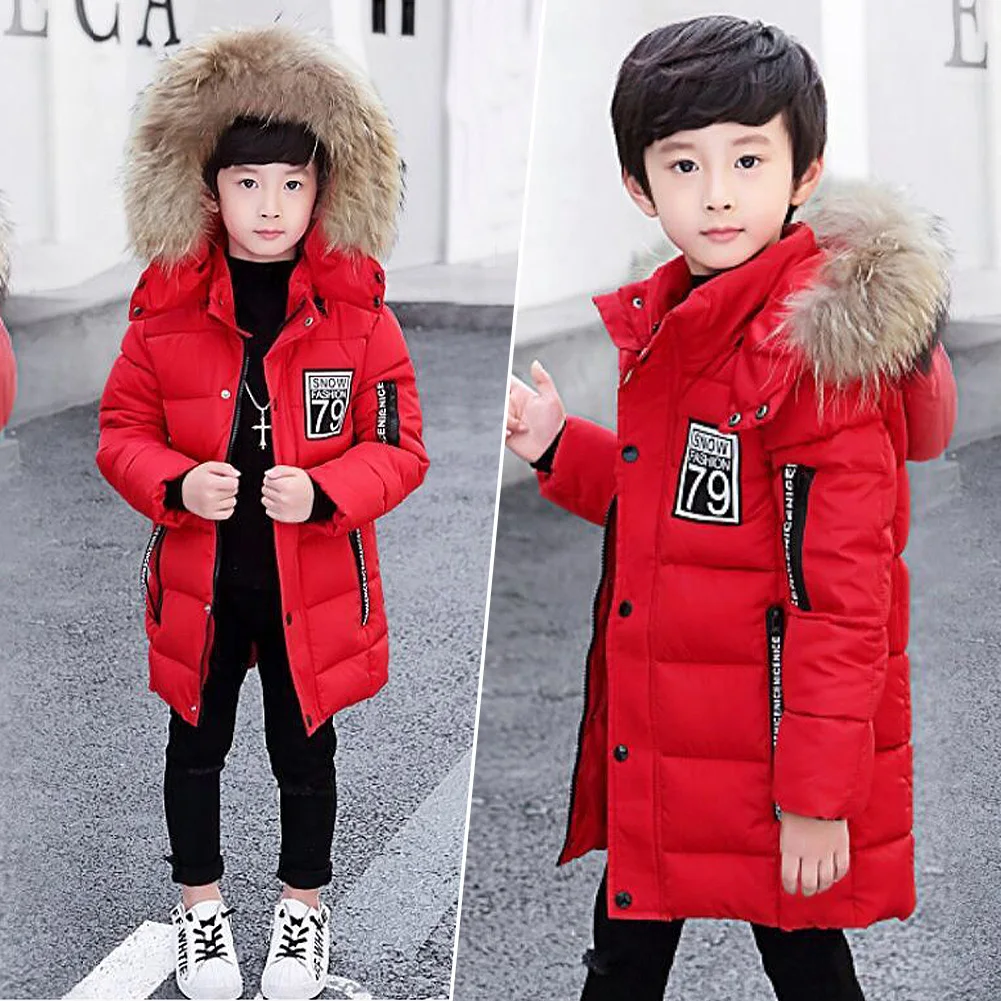 Winter Children's Down Jacket Boys Girls Cotton Padded Coat with Full Zipper Warm Long Fur Hood Windproof Kids Overcoat Parka