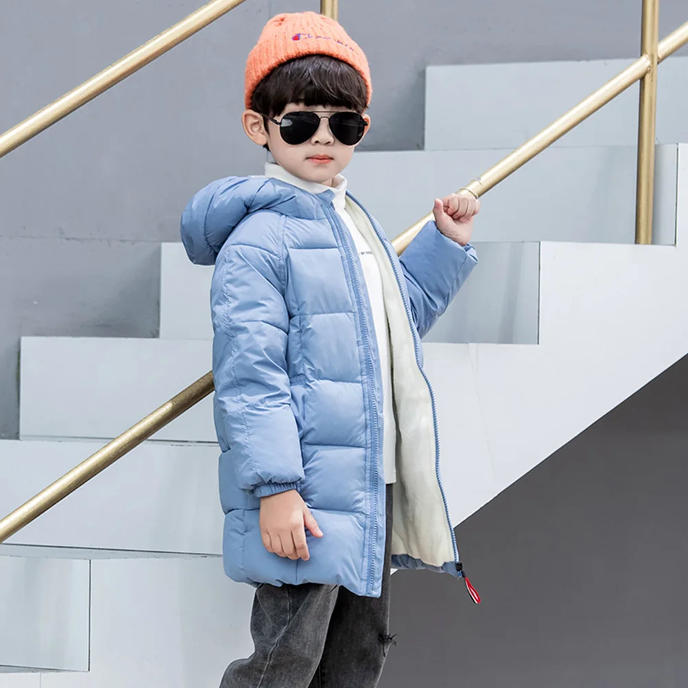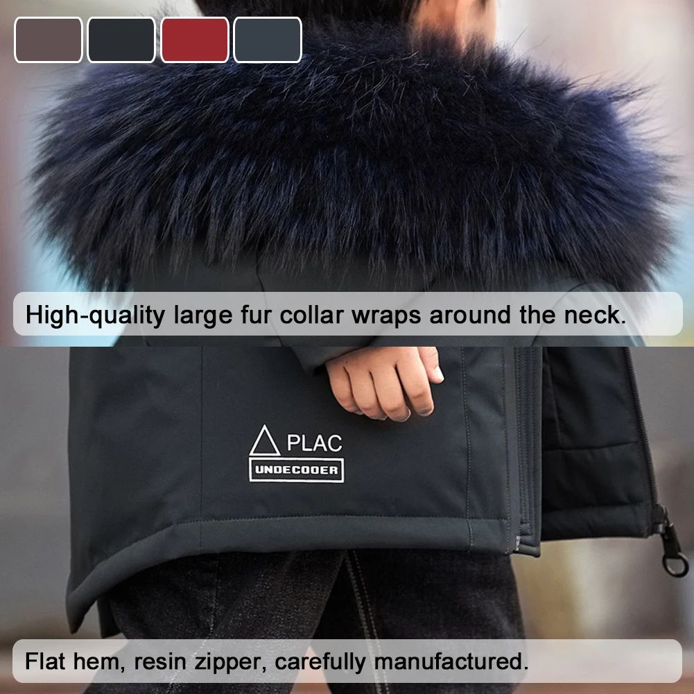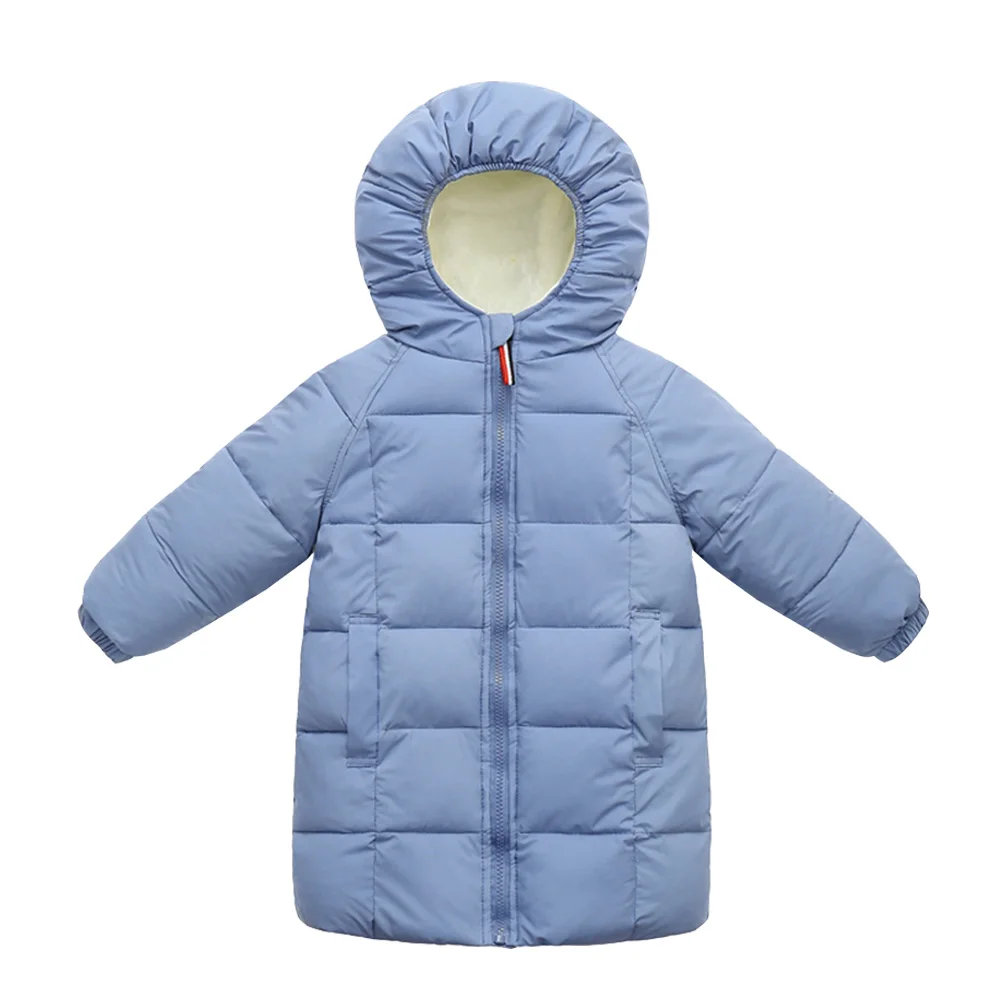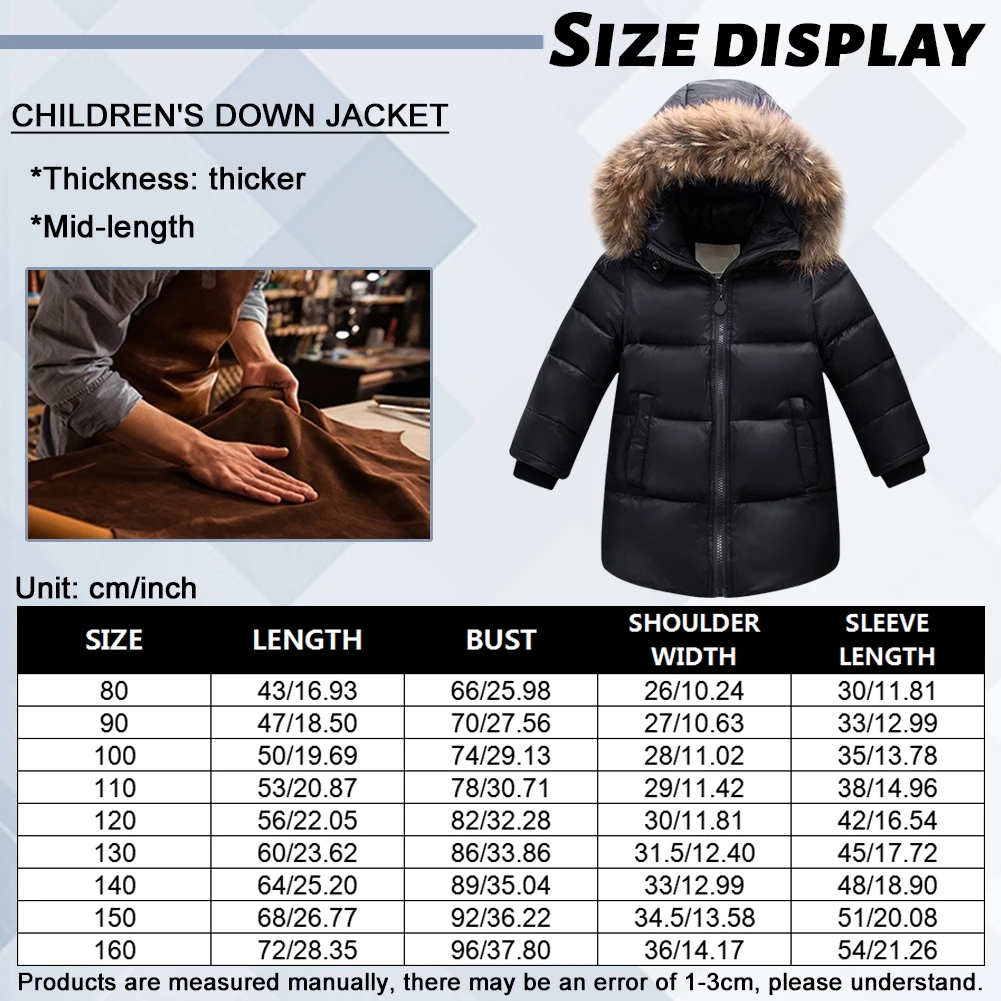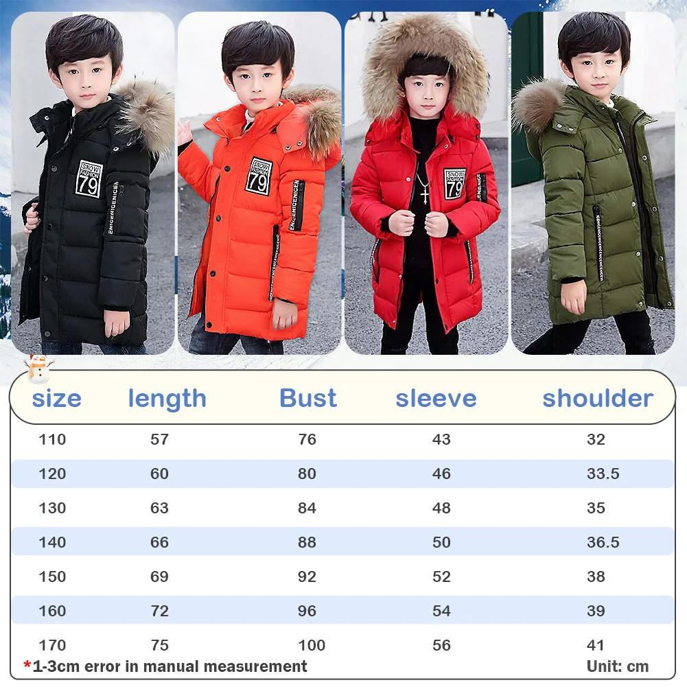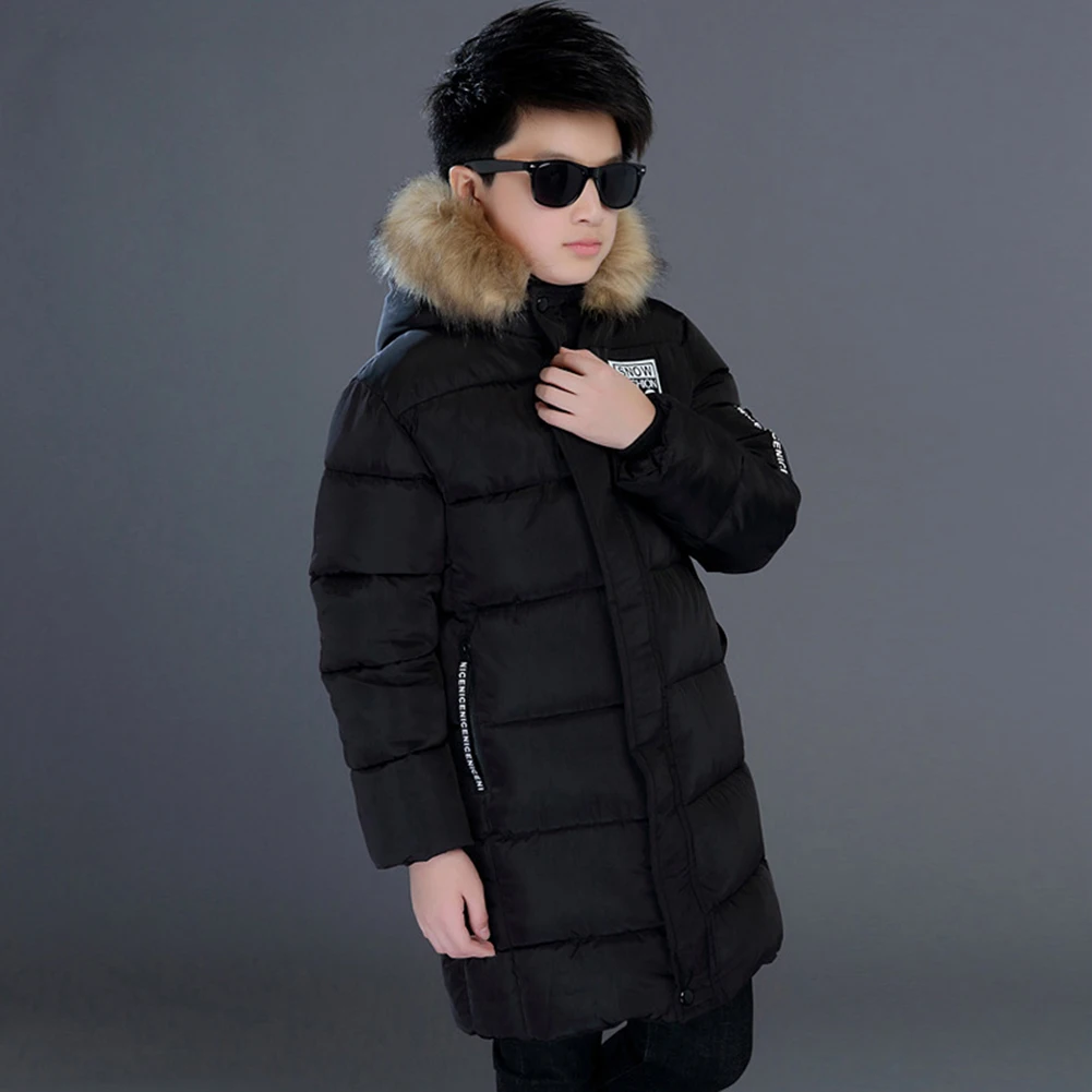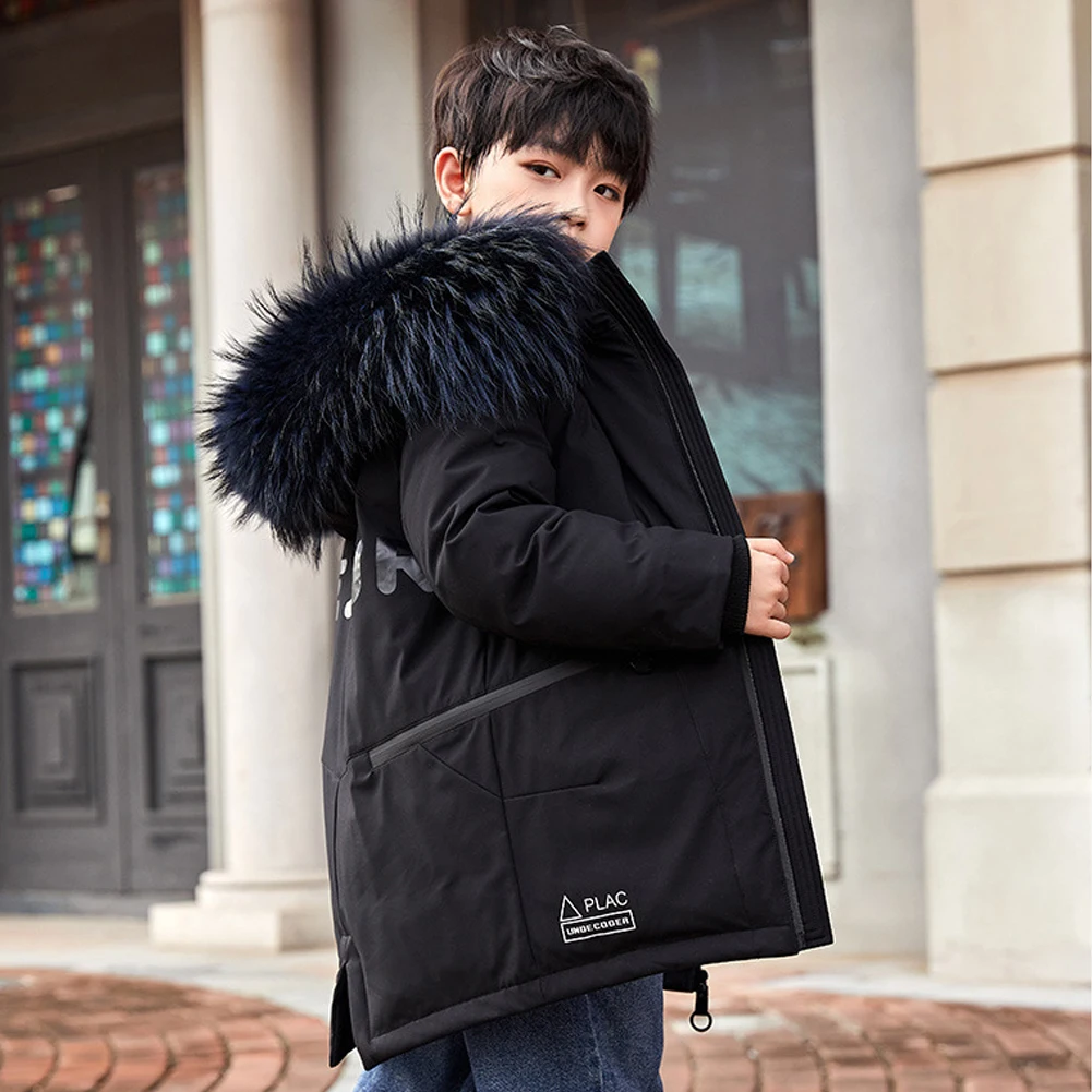 Winter Children's Down Jacket Boys Girls Cotton Padded Coat with Full Zipper Warm Long Fur Hood Windproof Kids Overcoat Parka
