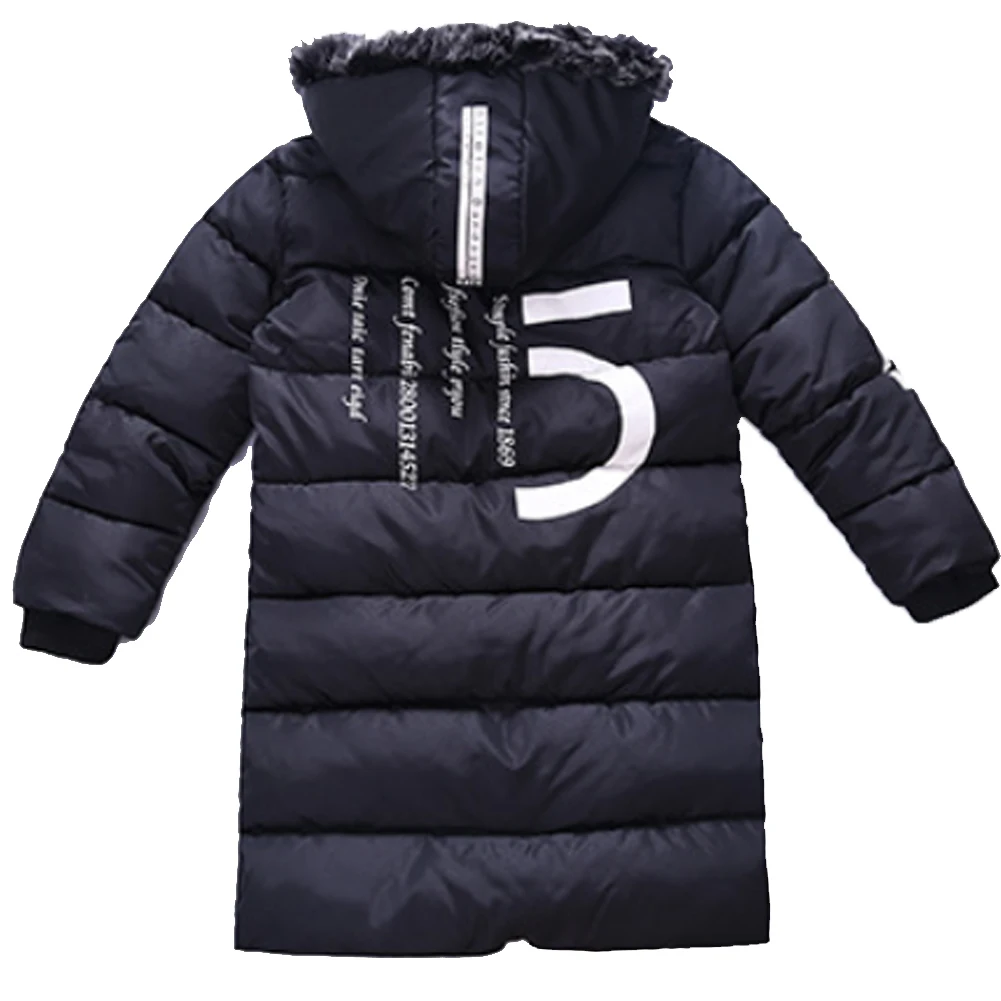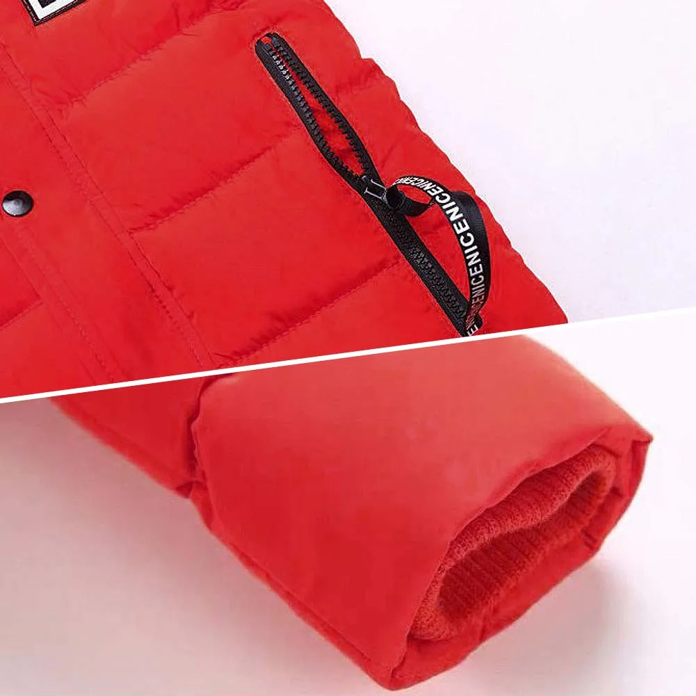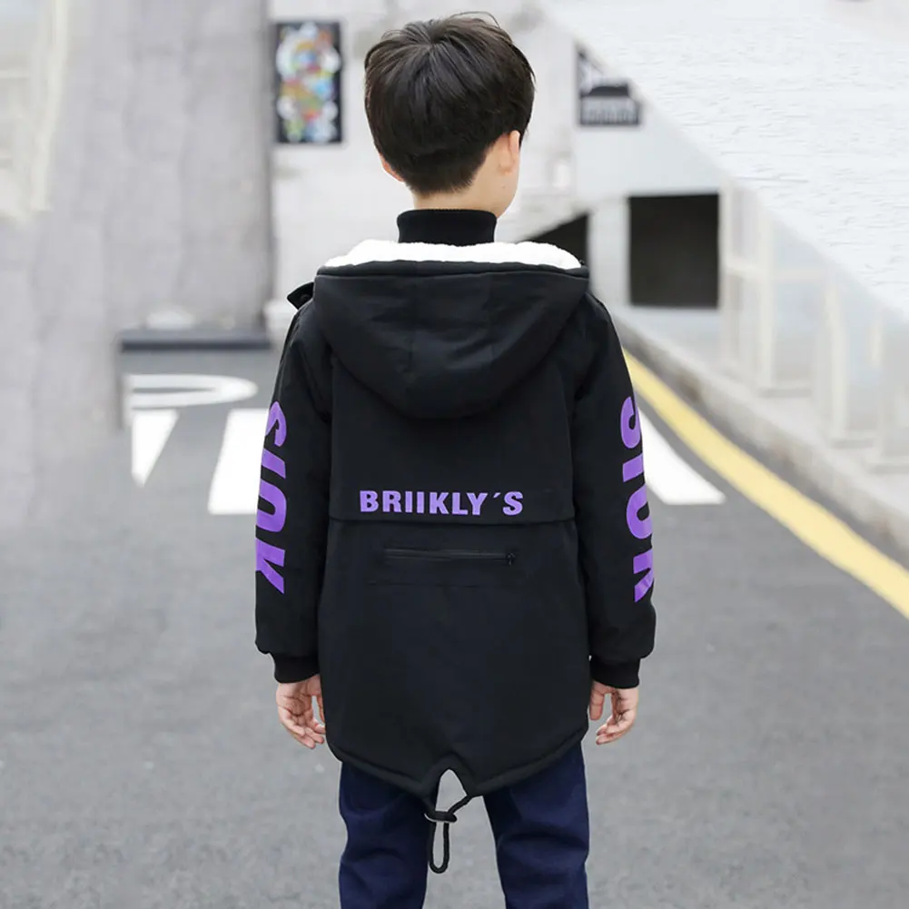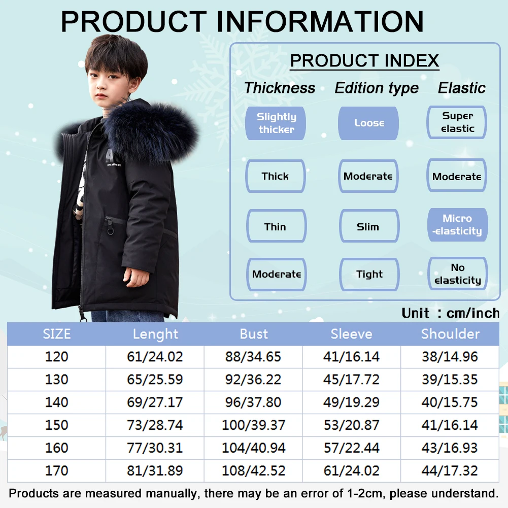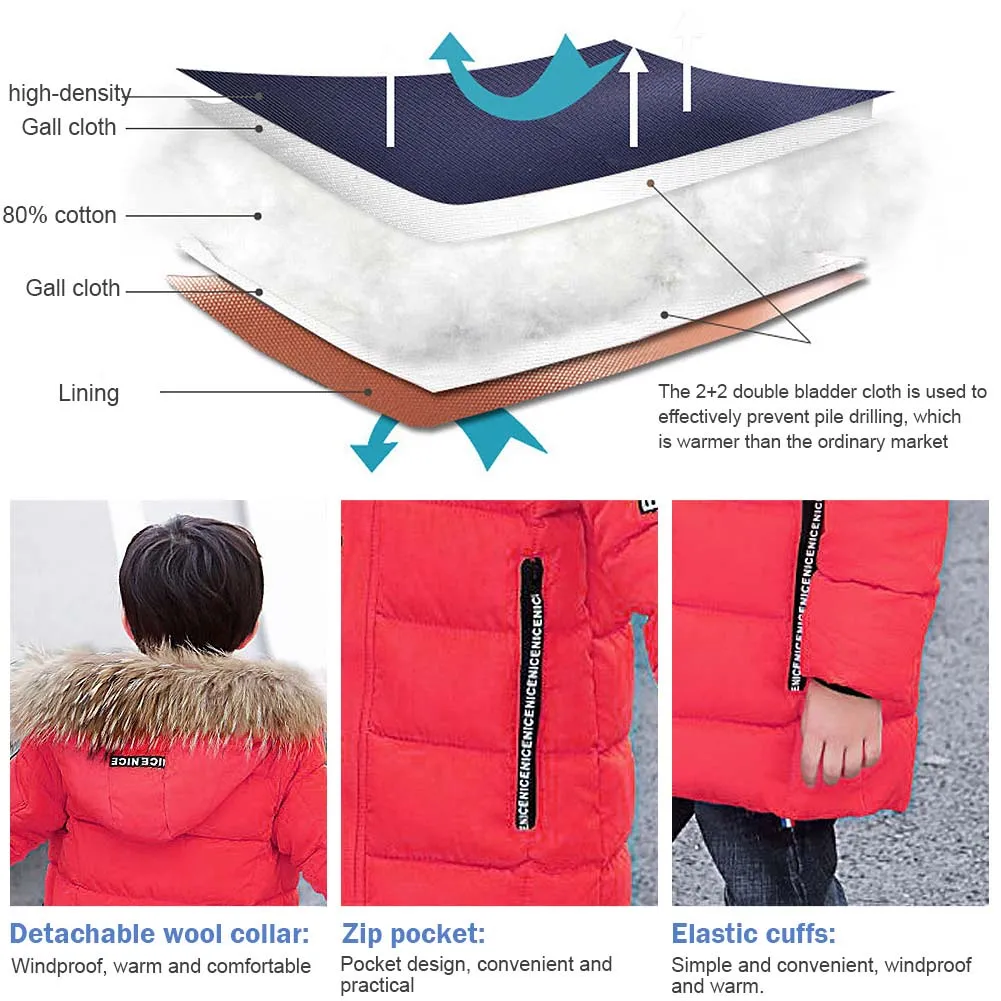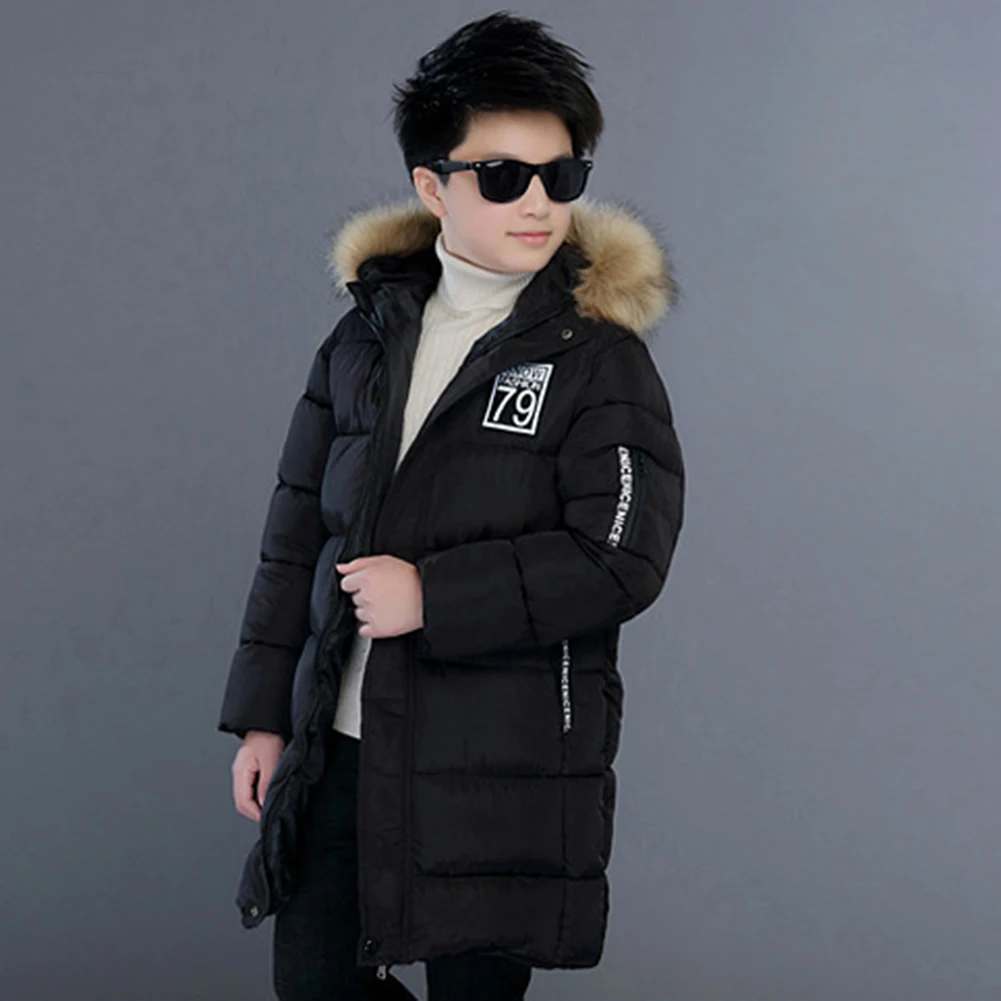 Winter Children's Down Jacket Boys Girls Cotton Padded Coat with Full Zipper Warm Long Fur Hood Windproof Kids Overcoat Parka