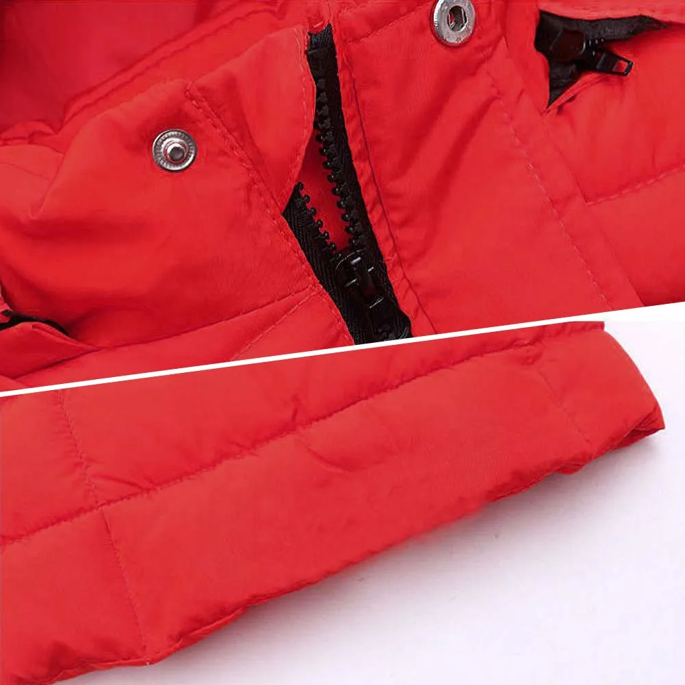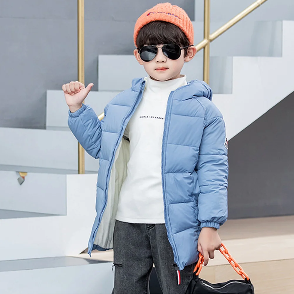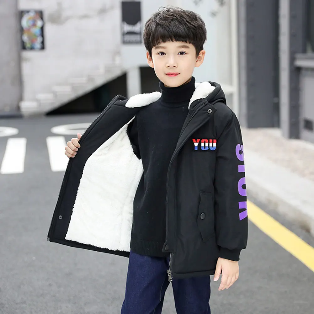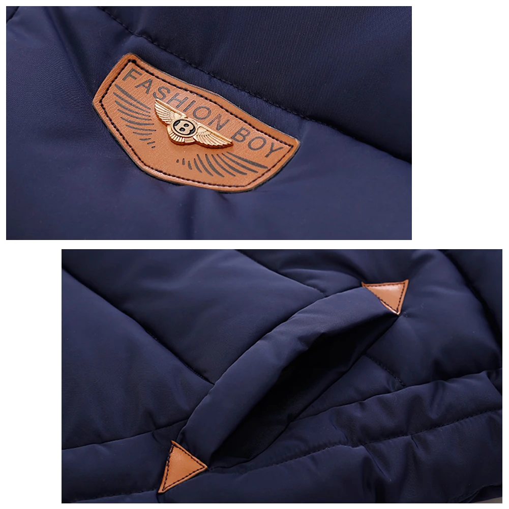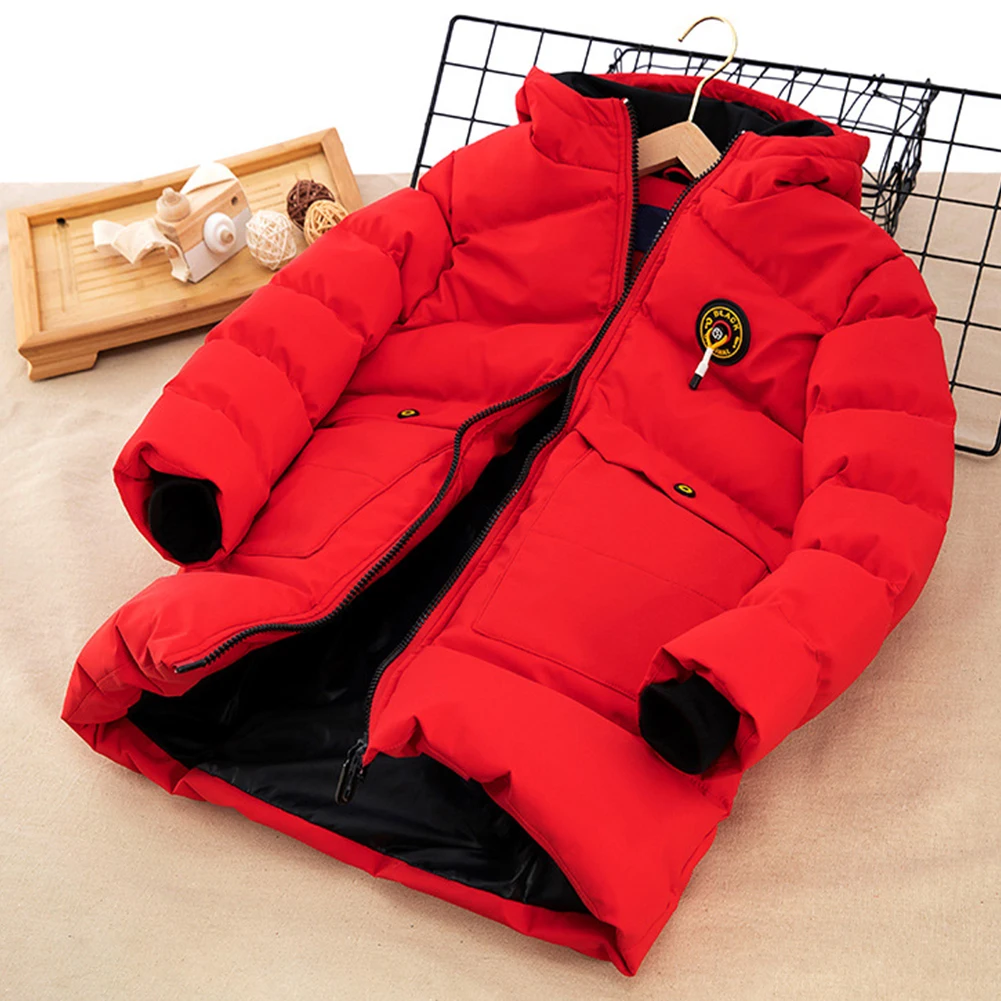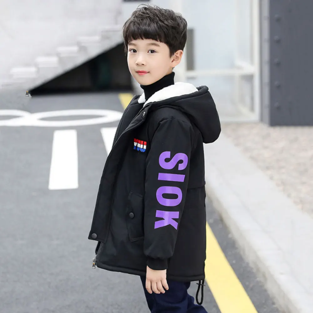 Winter Children's Down Jacket Boys Girls Cotton Padded Coat with Full Zipper Warm Long Fur Hood Windproof Kids Overcoat Parka