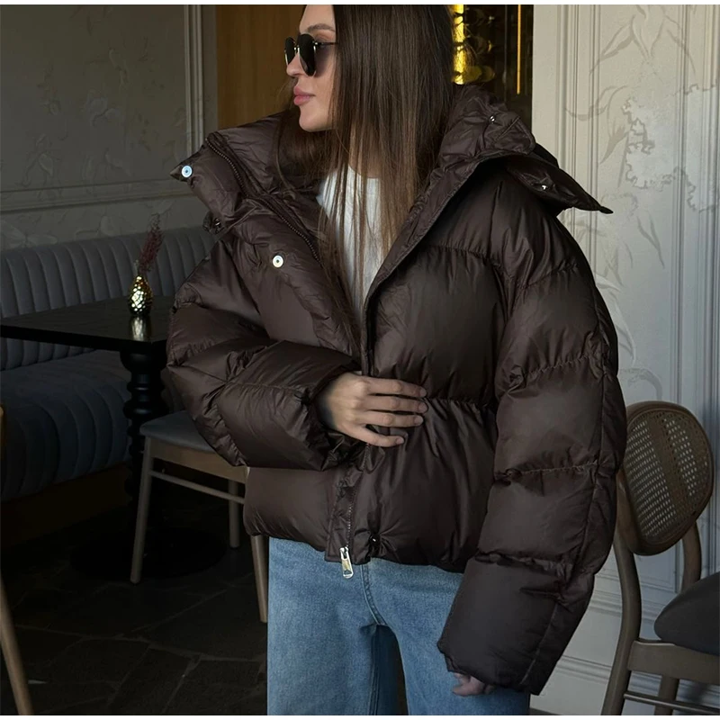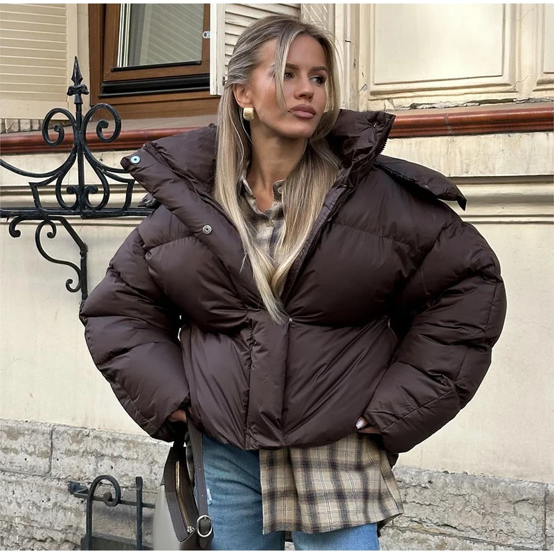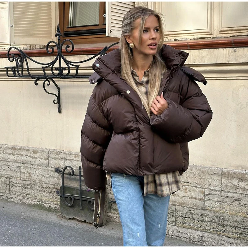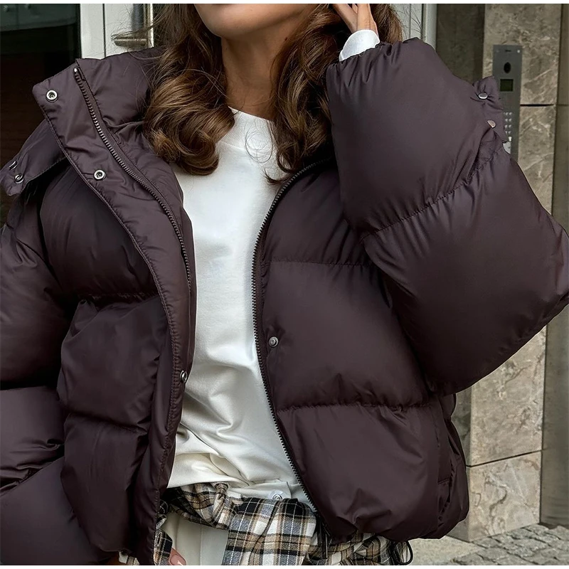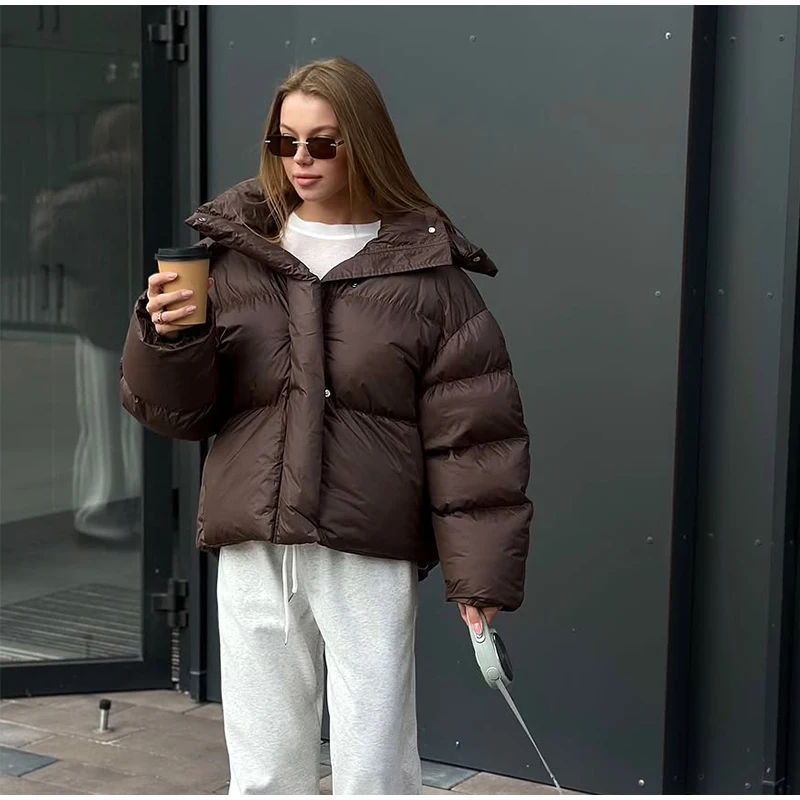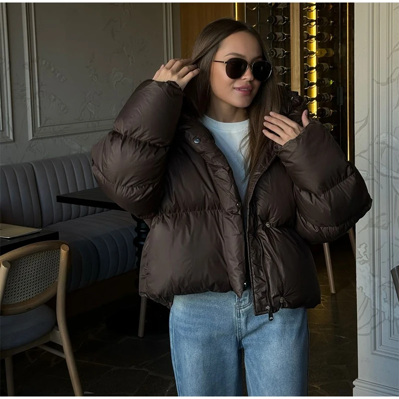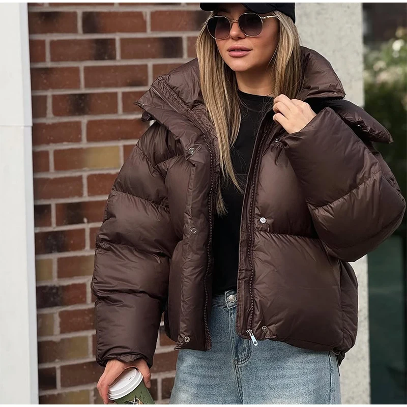 Women Autumn Hooded Short Cotton Coat Casual Brown Stand Collar Full Sleeve Loose Jacket Chic Lady Winter Office Commute Outwear