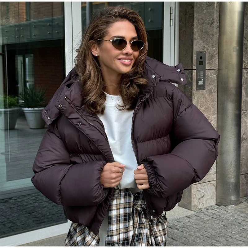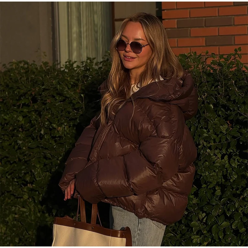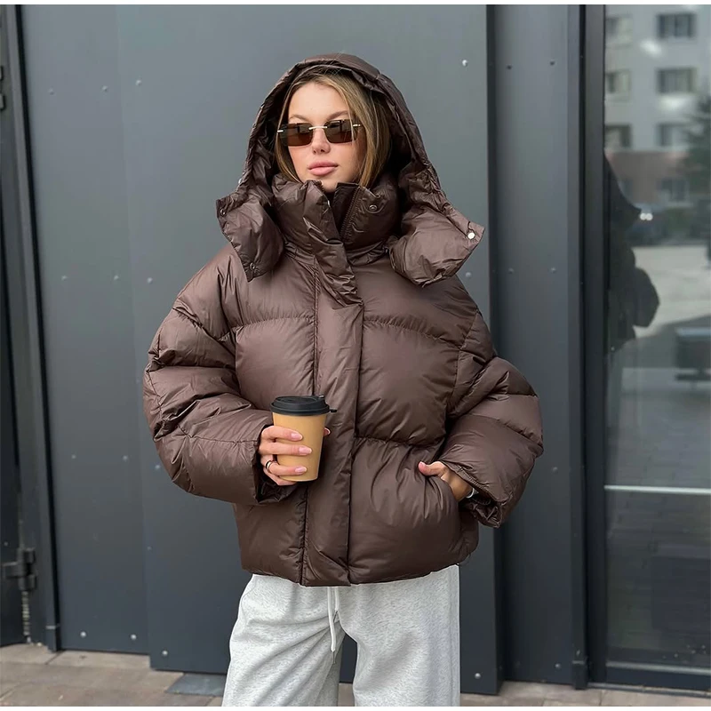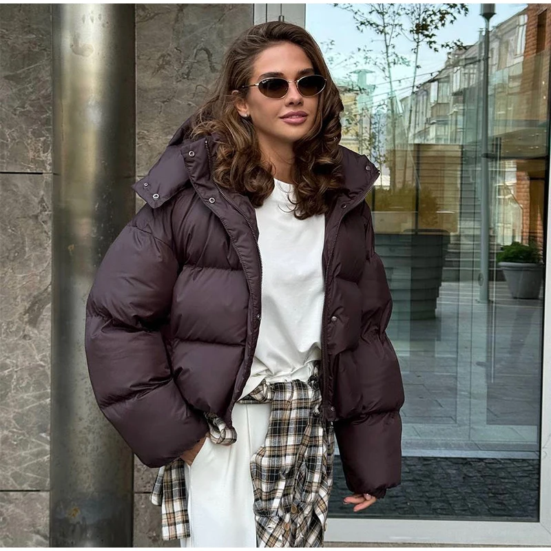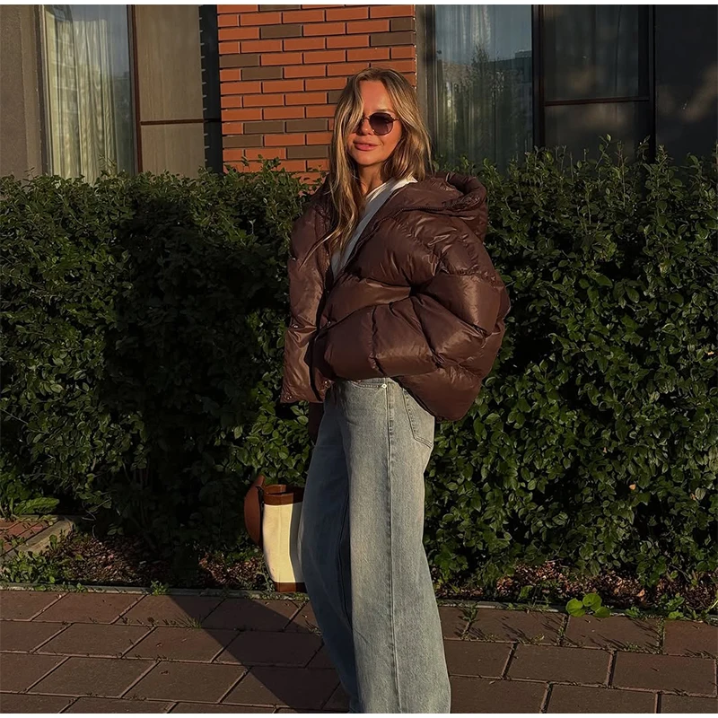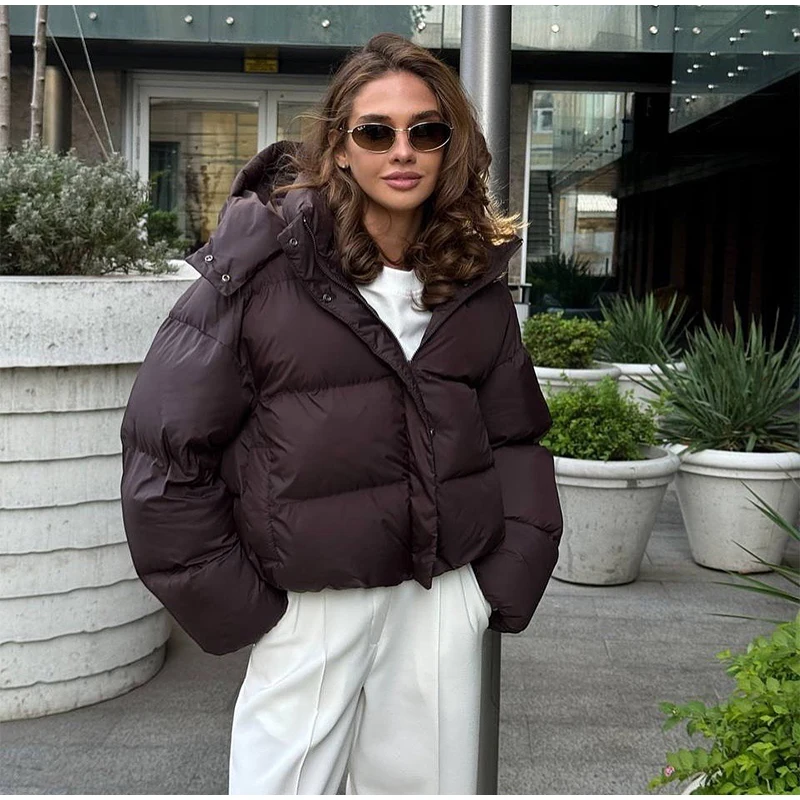 Women Autumn Hooded Short Cotton Coat Casual Brown Stand Collar Full Sleeve Loose Jacket Chic Lady Winter Office Commute Outwear