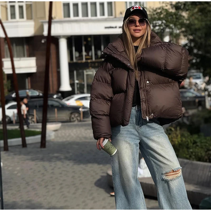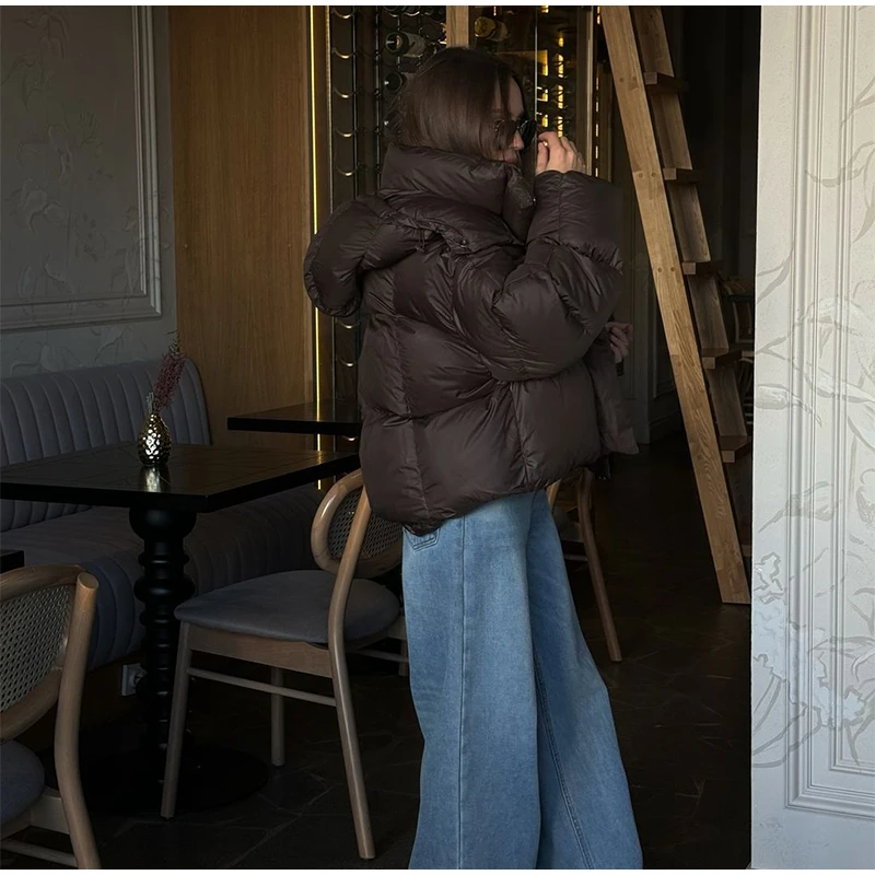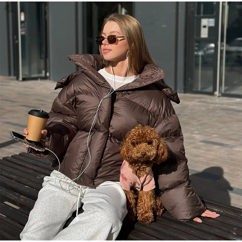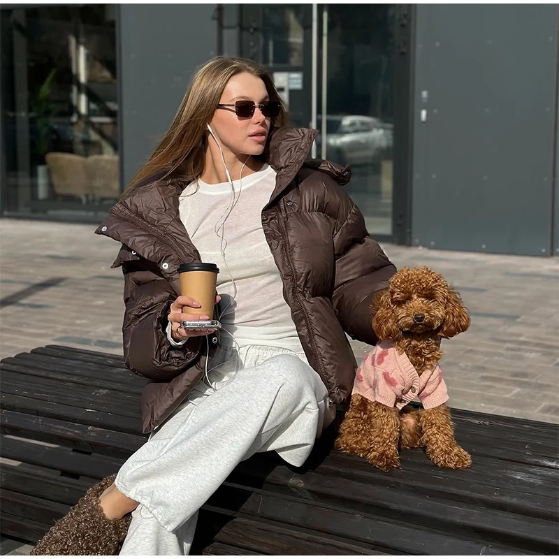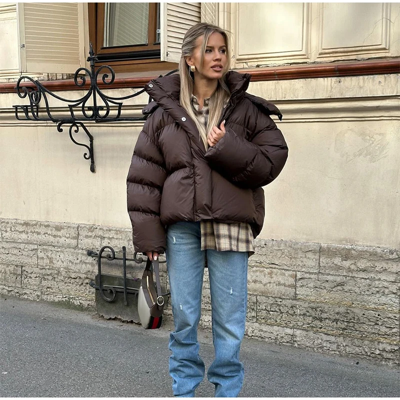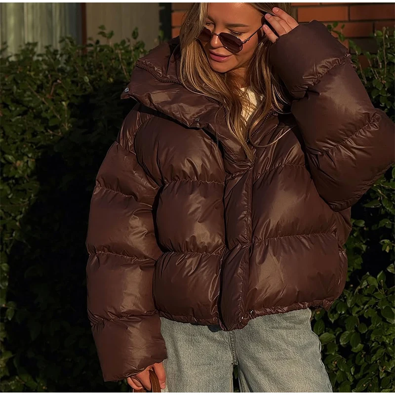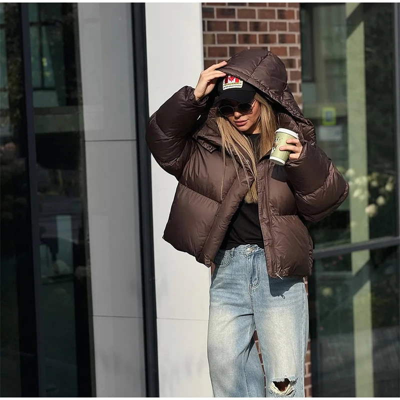 Women Autumn Hooded Short Cotton Coat Casual Brown Stand Collar Full Sleeve Loose Jacket Chic Lady Winter Office Commute Outwear